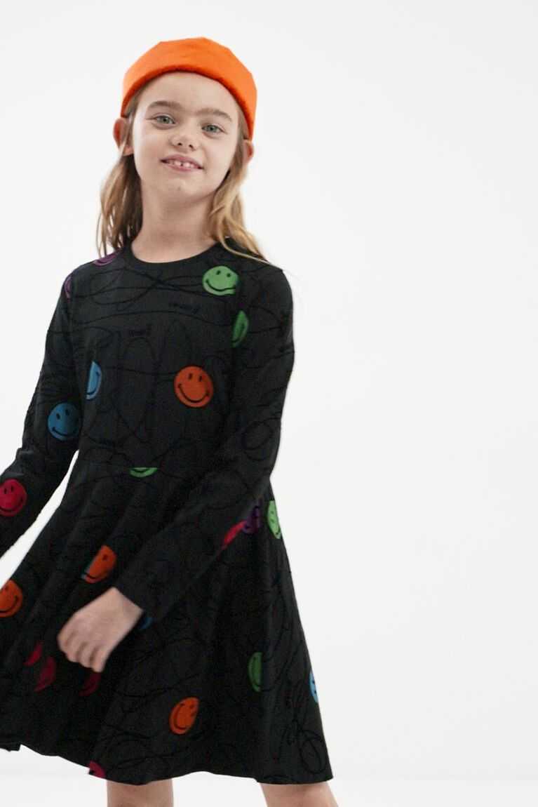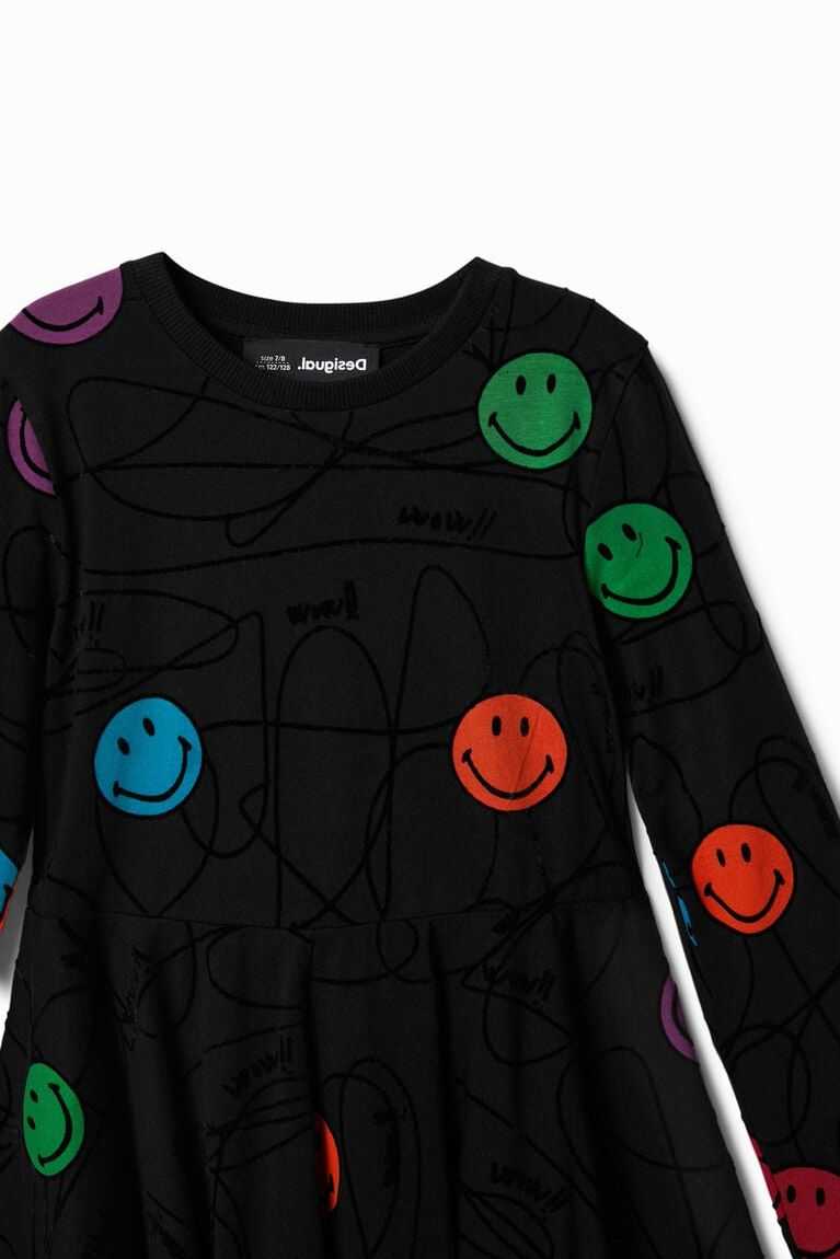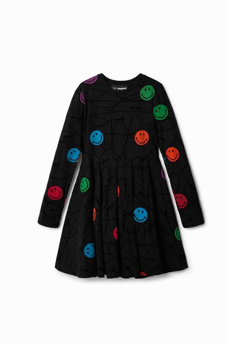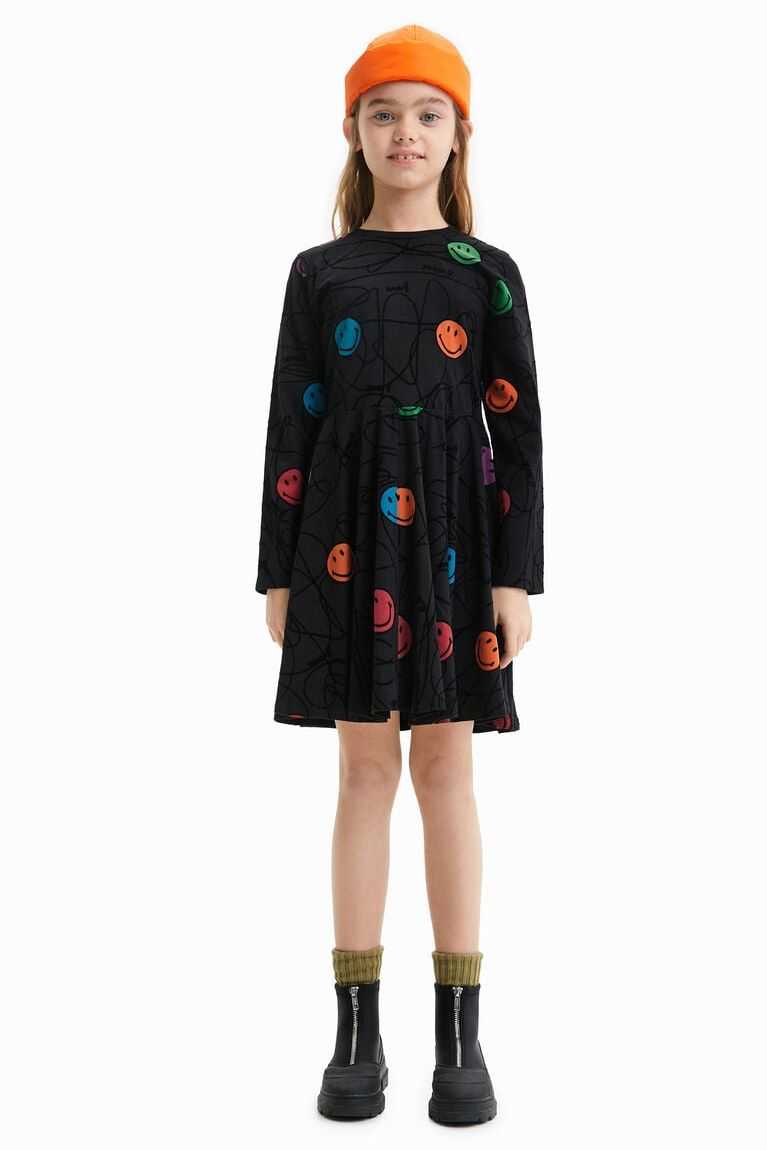 Tone-on-tone printed graphics are the backdrop for the different coloured Smiley? print that decorates this cotton long-sleeve skater dress.