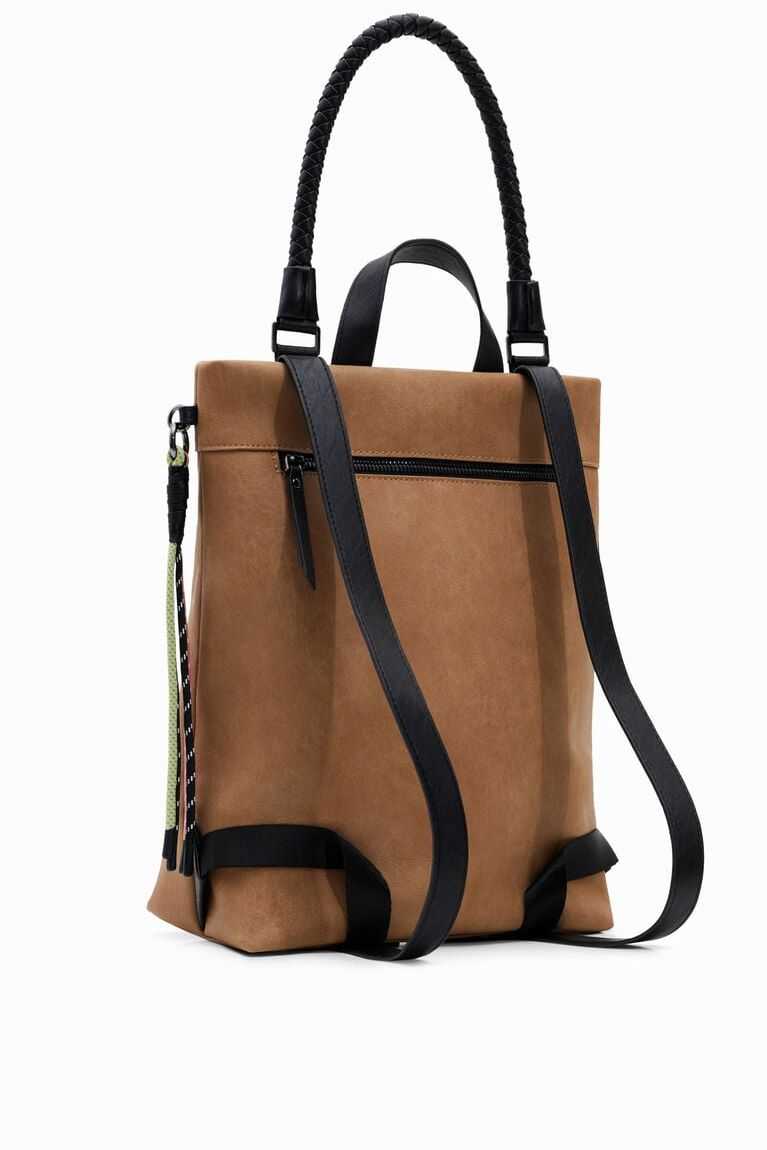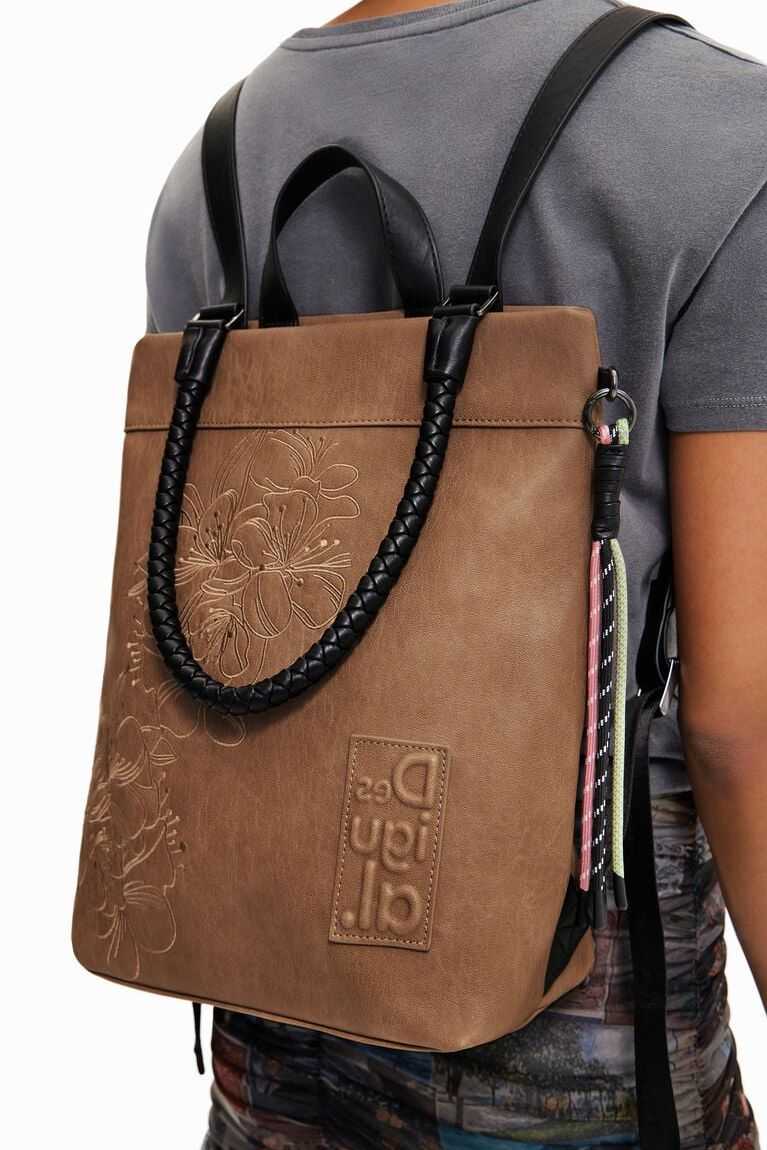 A faux-leather backpack with a very soft feel and embossed flower detailing on the front. With multiple straps for versatility.
