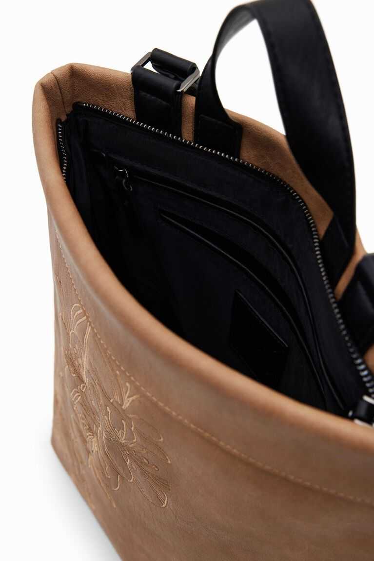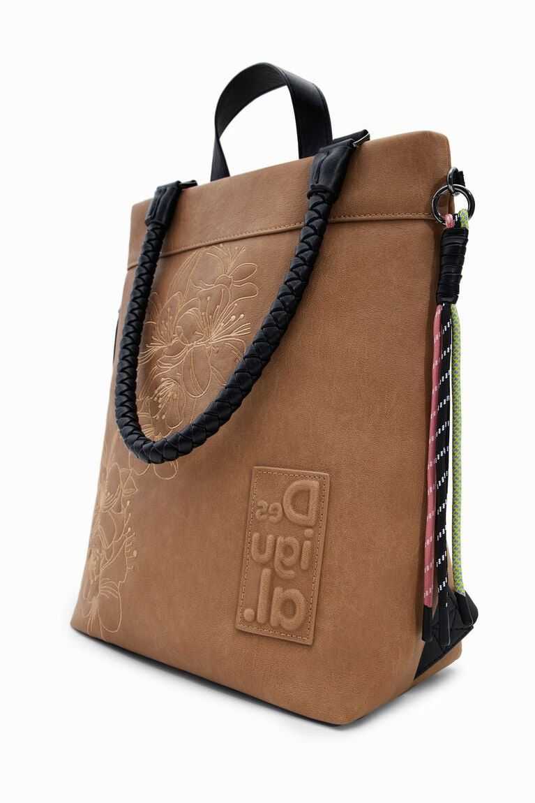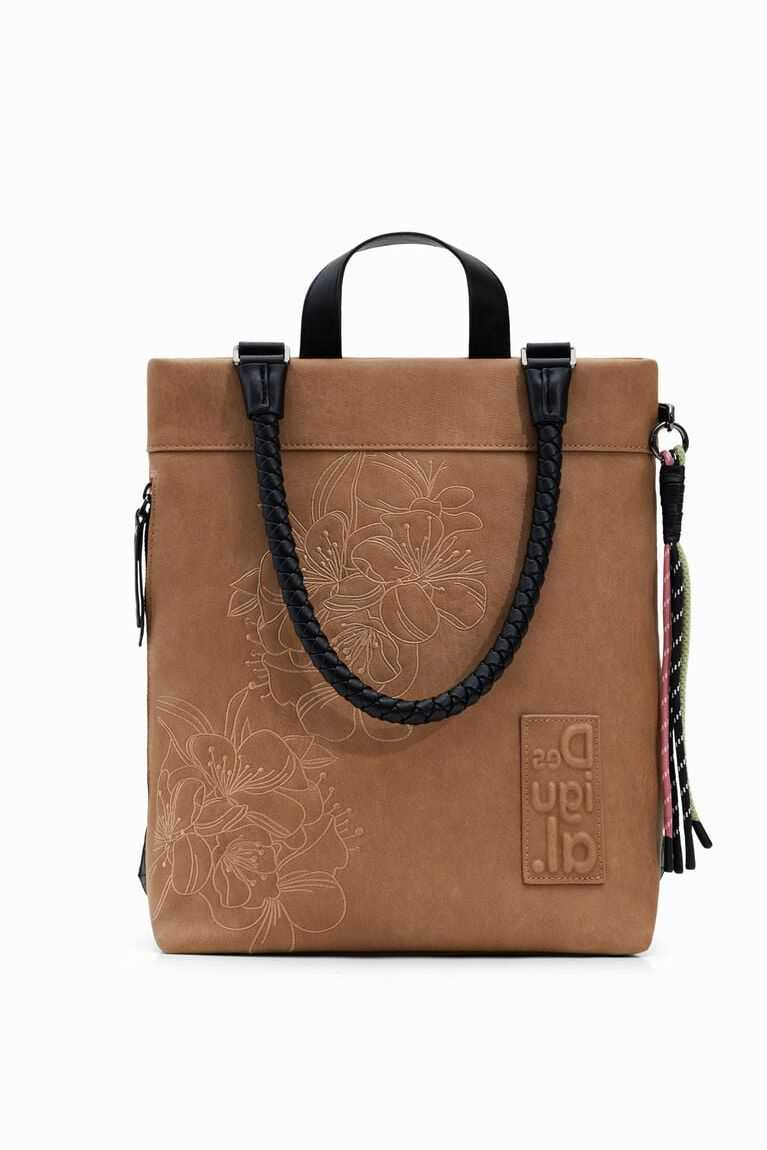 A faux-leather backpack with a very soft feel and embossed flower detailing on the front. With multiple straps for versatility.