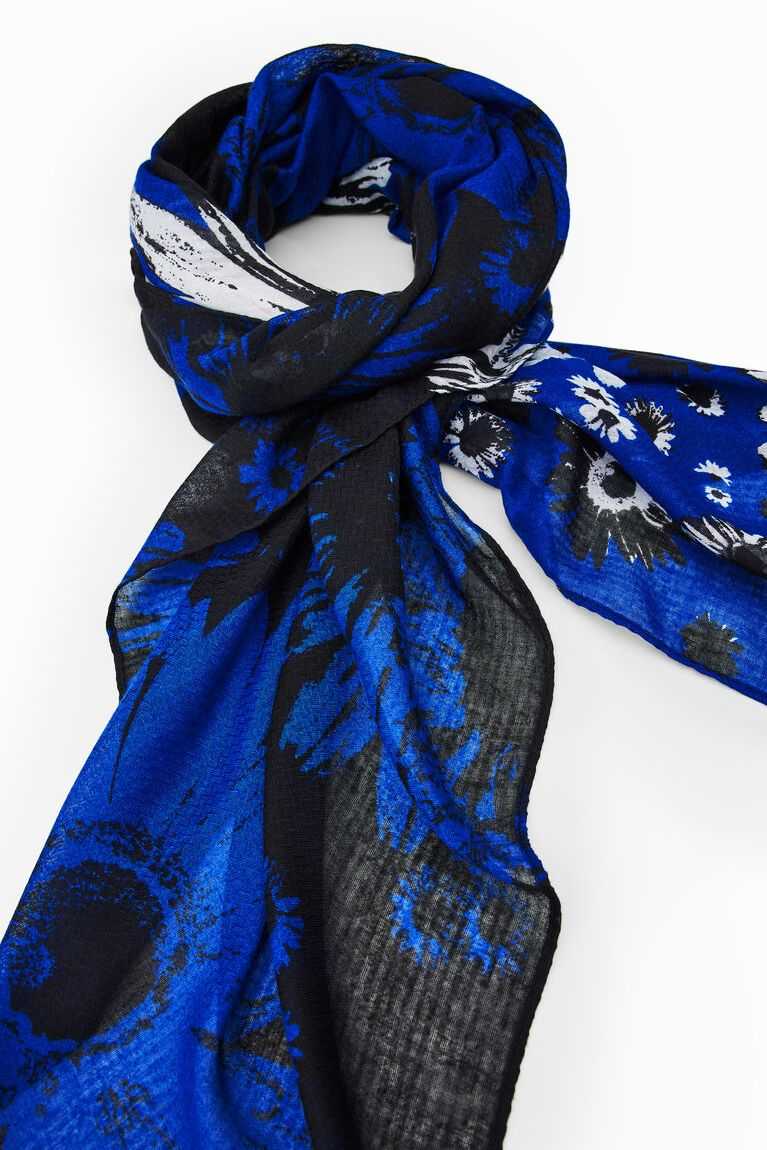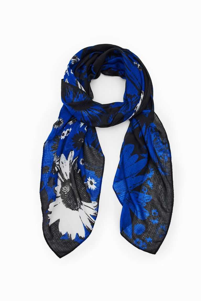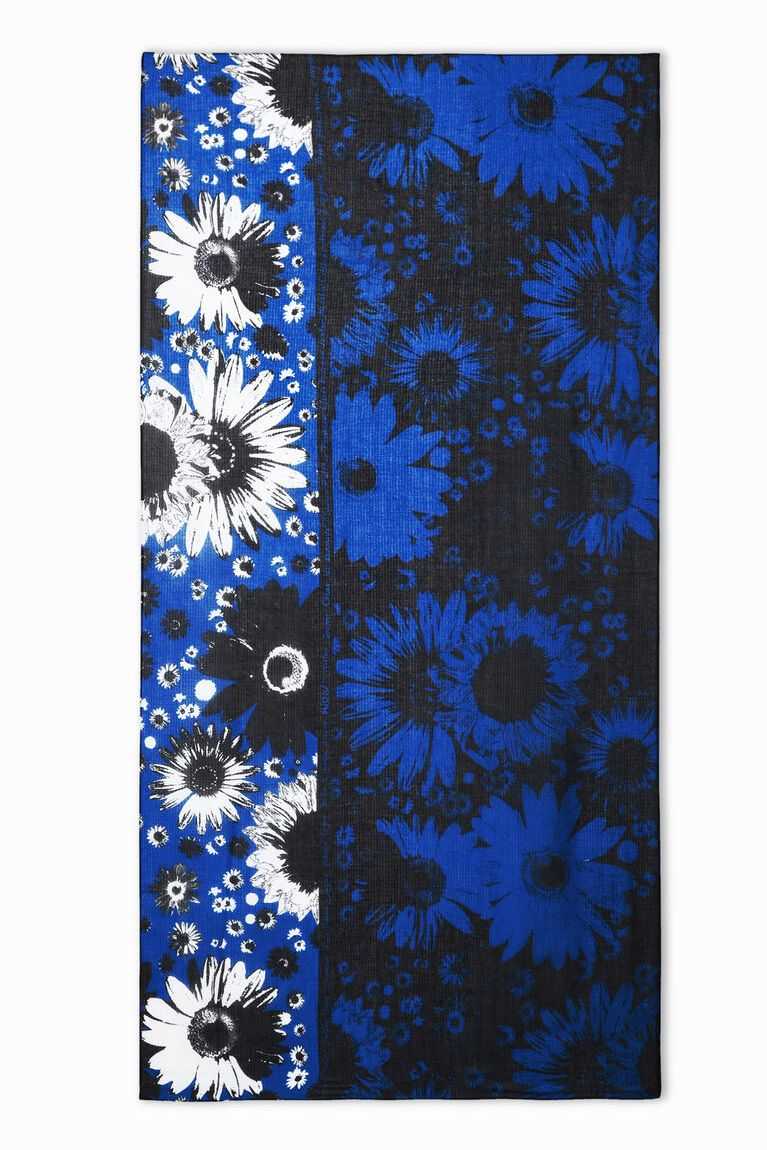 Rectangular foulard with large multicoloured daisies that pair perfectly with other accessories from the collection. Made from recycled fibres.