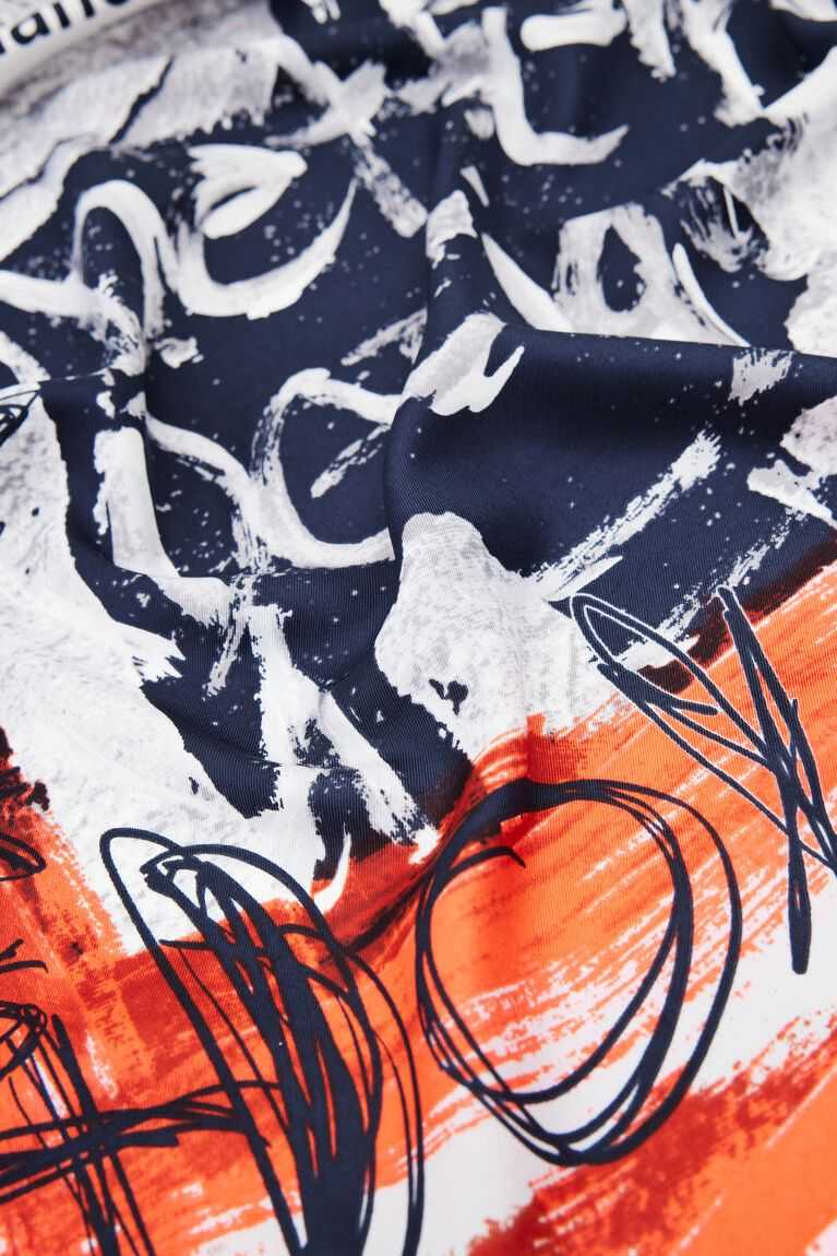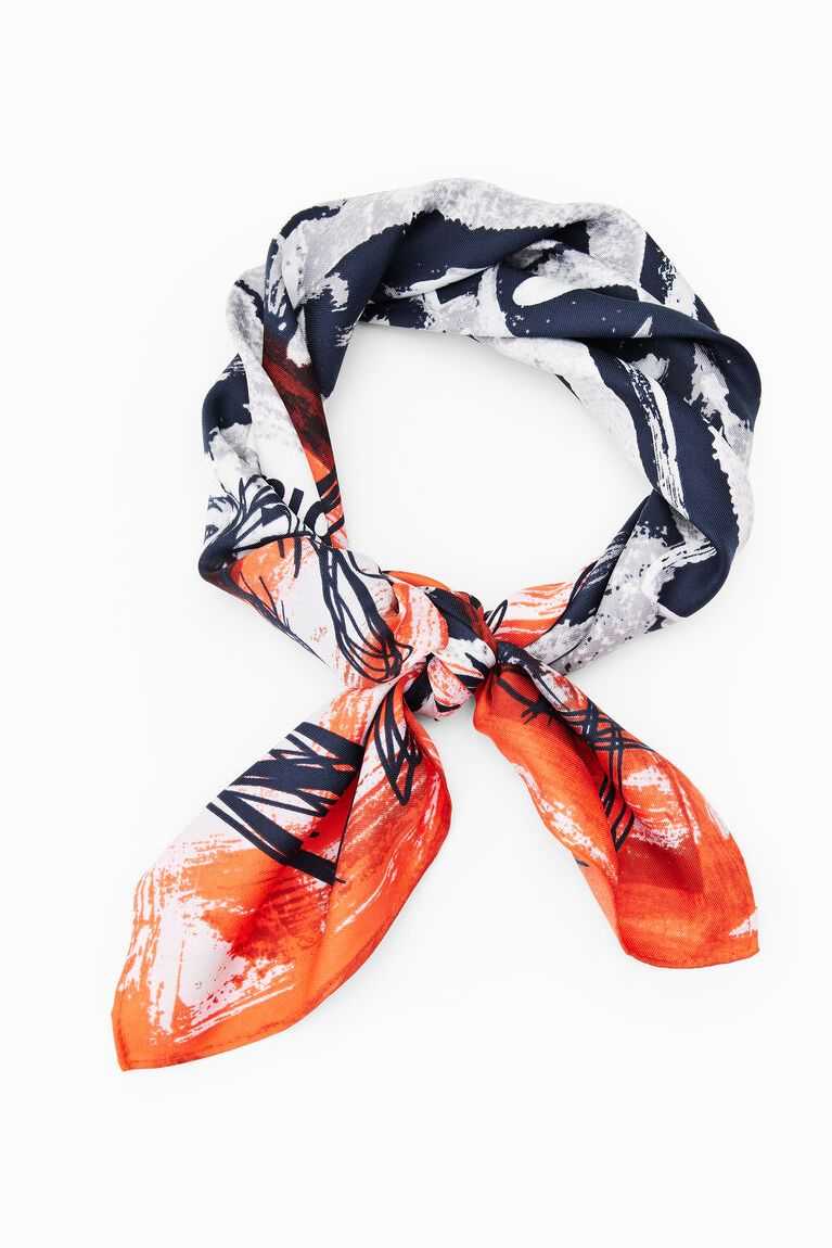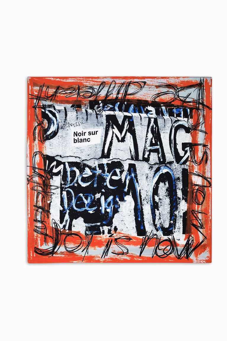 Square foulard in a graffiti-like lettering print with a very urban look and messages from the collection. Made from recycled fibres.