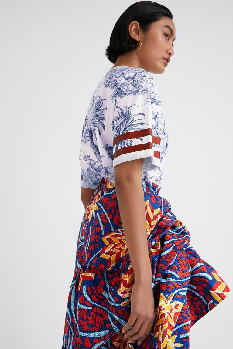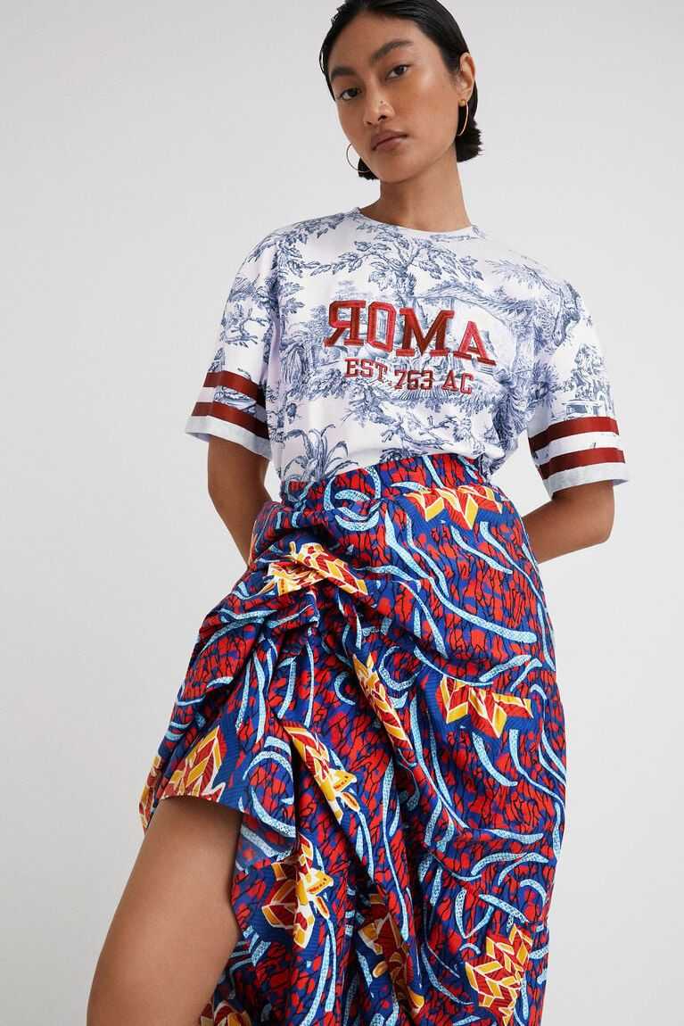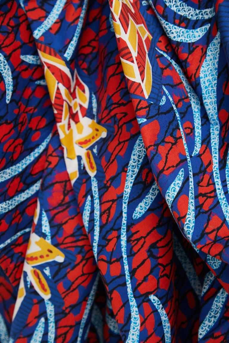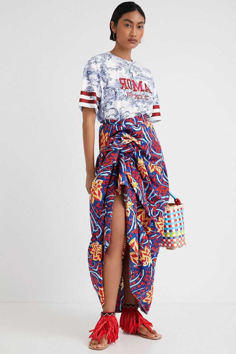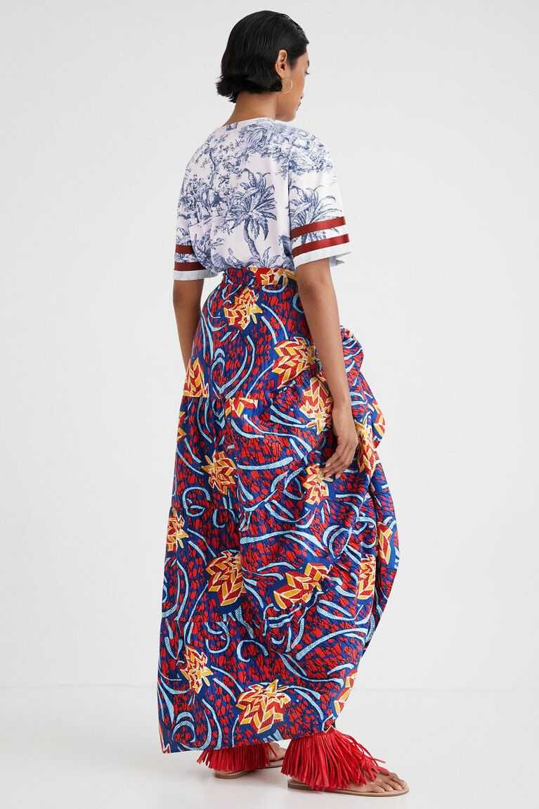 Featuring an ethnic wax print and an adjustable detail to change the length of one side, this long skirt made from very soft cotton fabric and designed by Stella Jean can be worn in multiple ways.