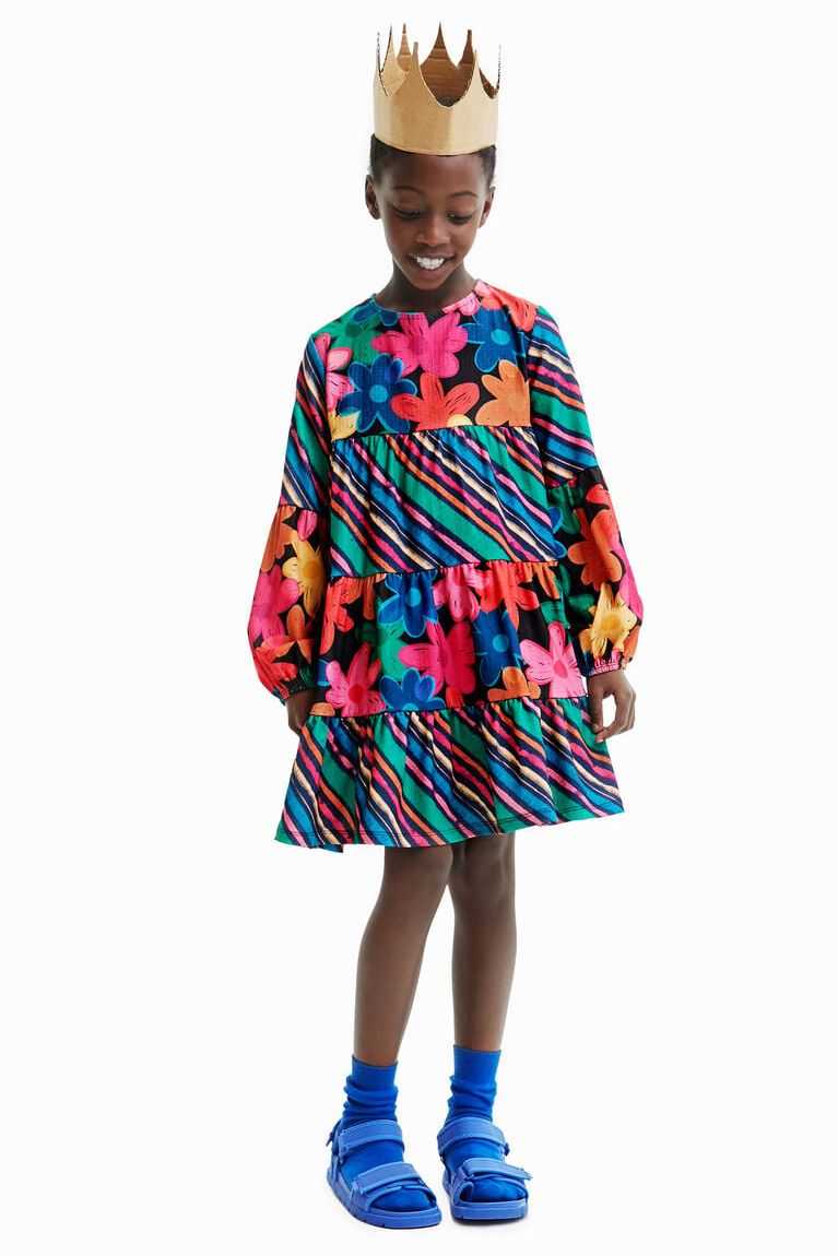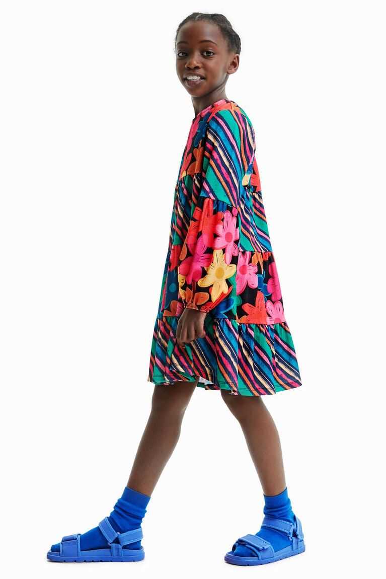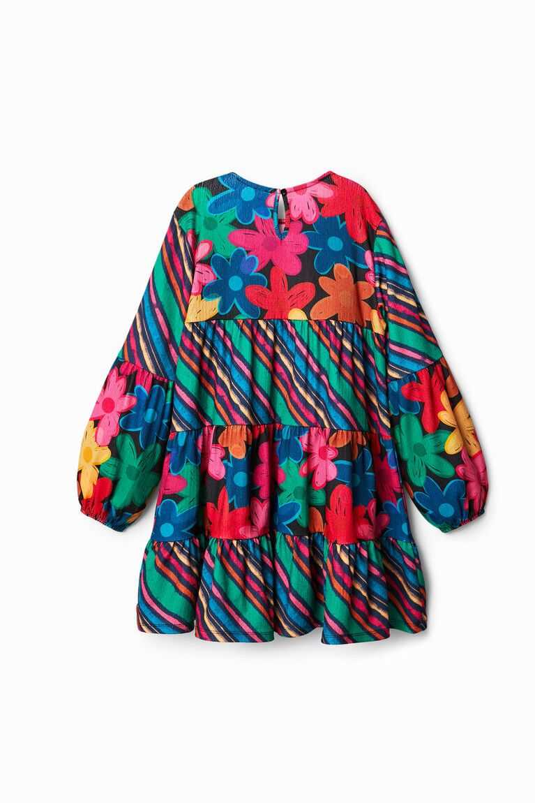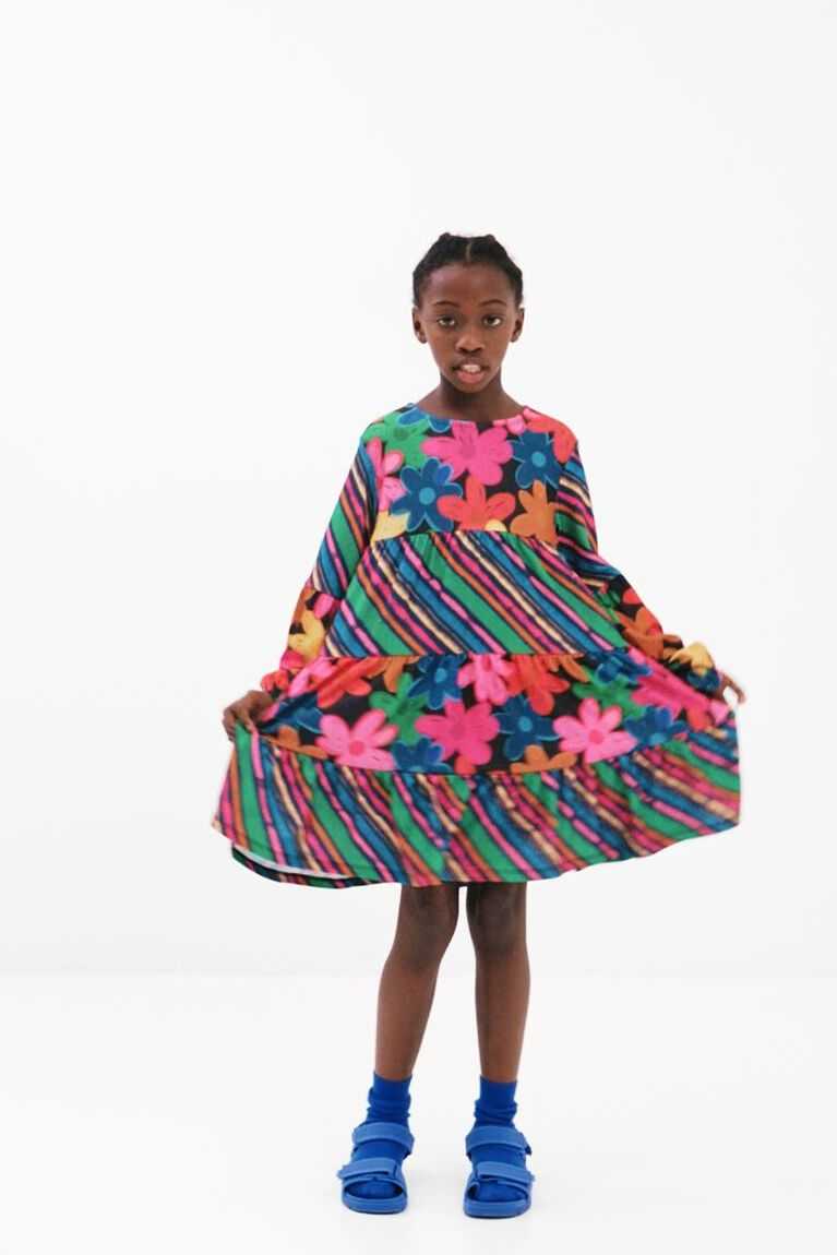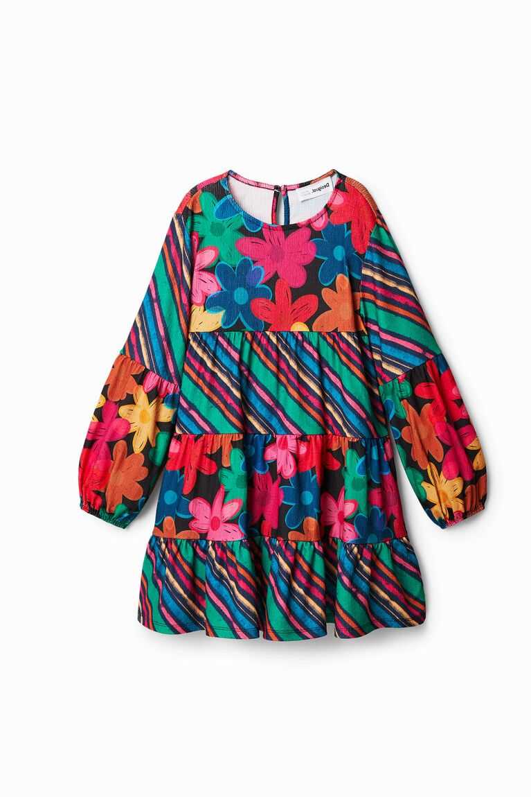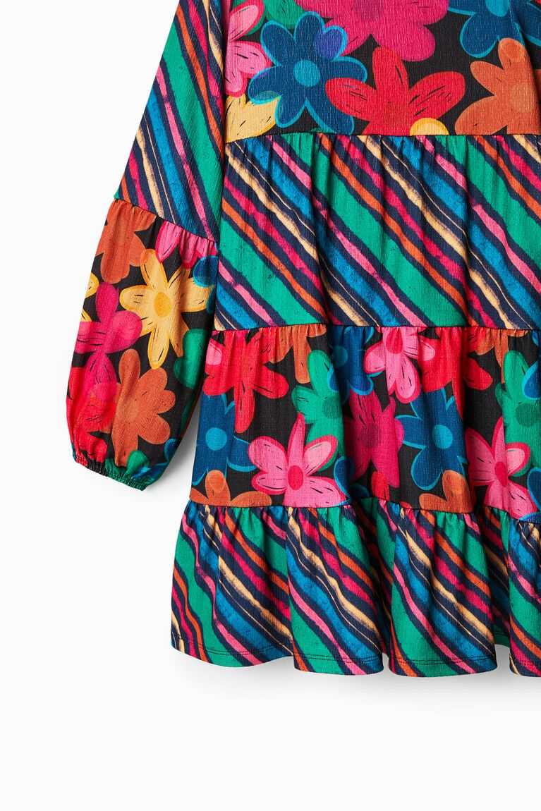 A very comfortable dress with long balloon sleeves in a patchwork of striped and floral positional prints.
