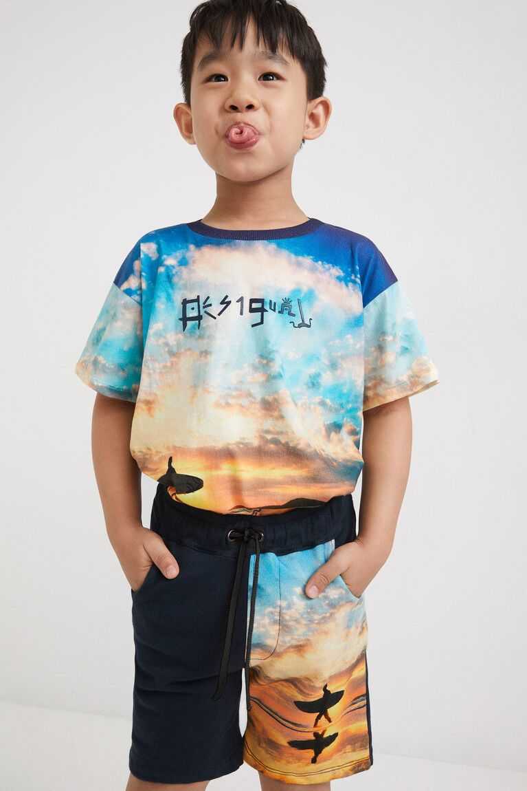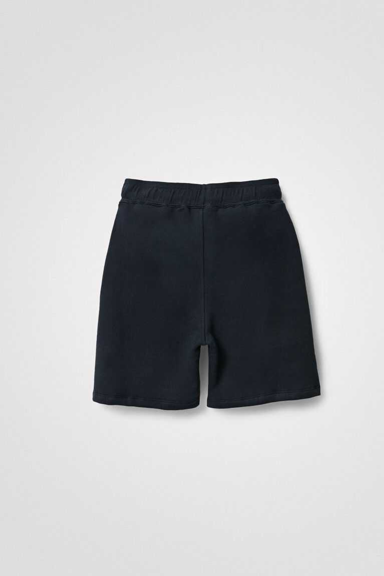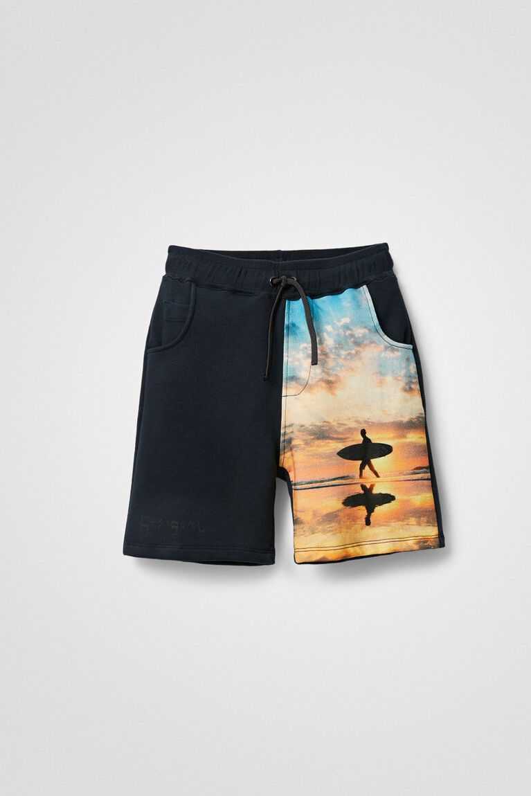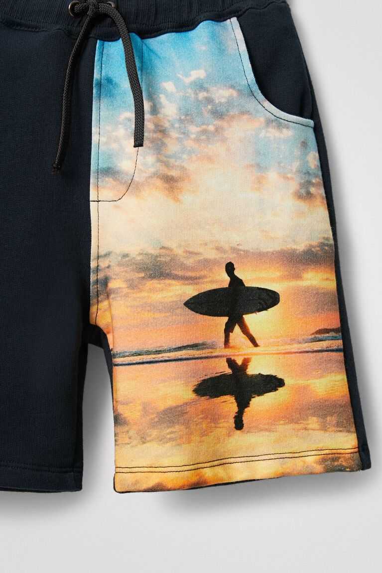 A summery landscape of the beach and surfing bring life to these navy-blue drawstring shorts made from sustainable cotton.