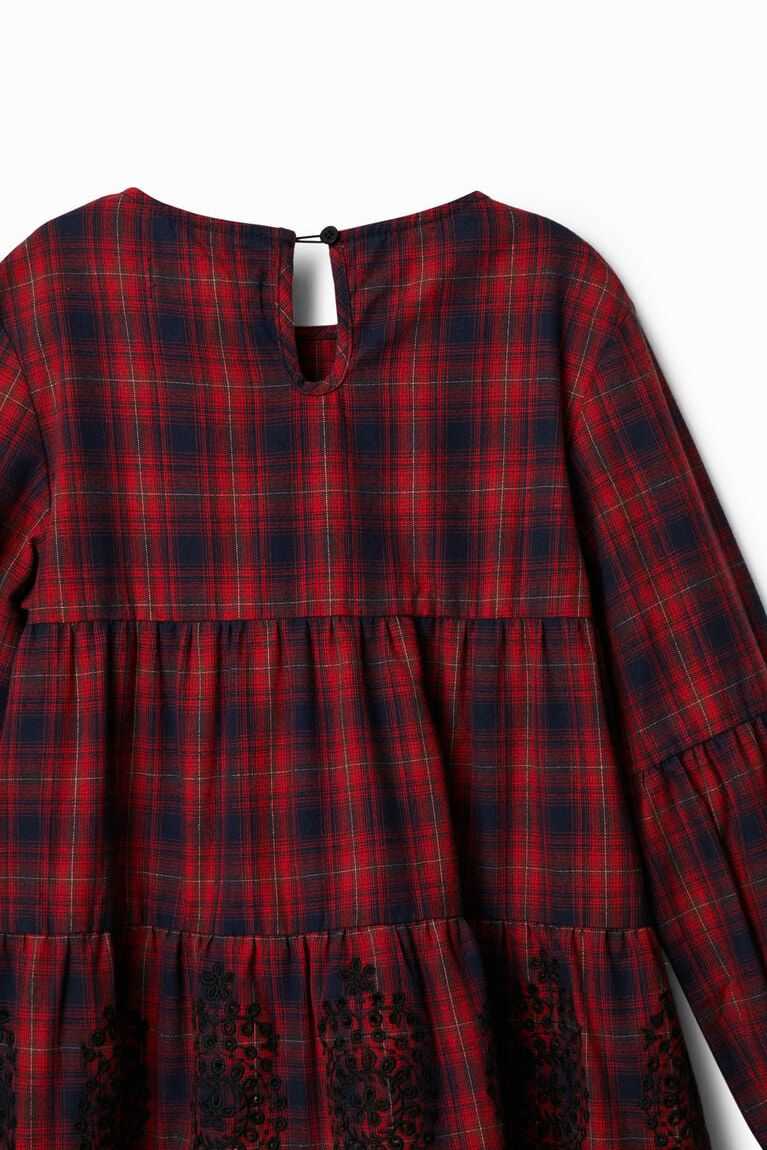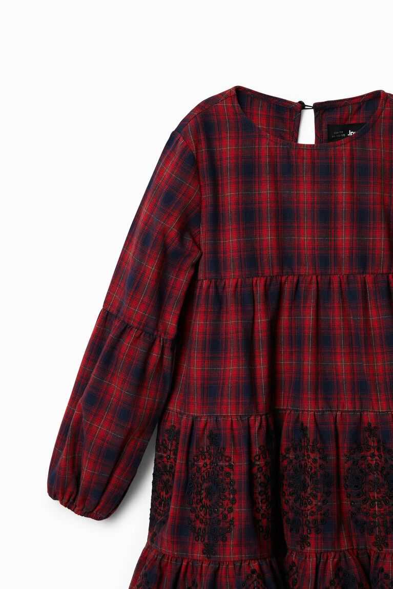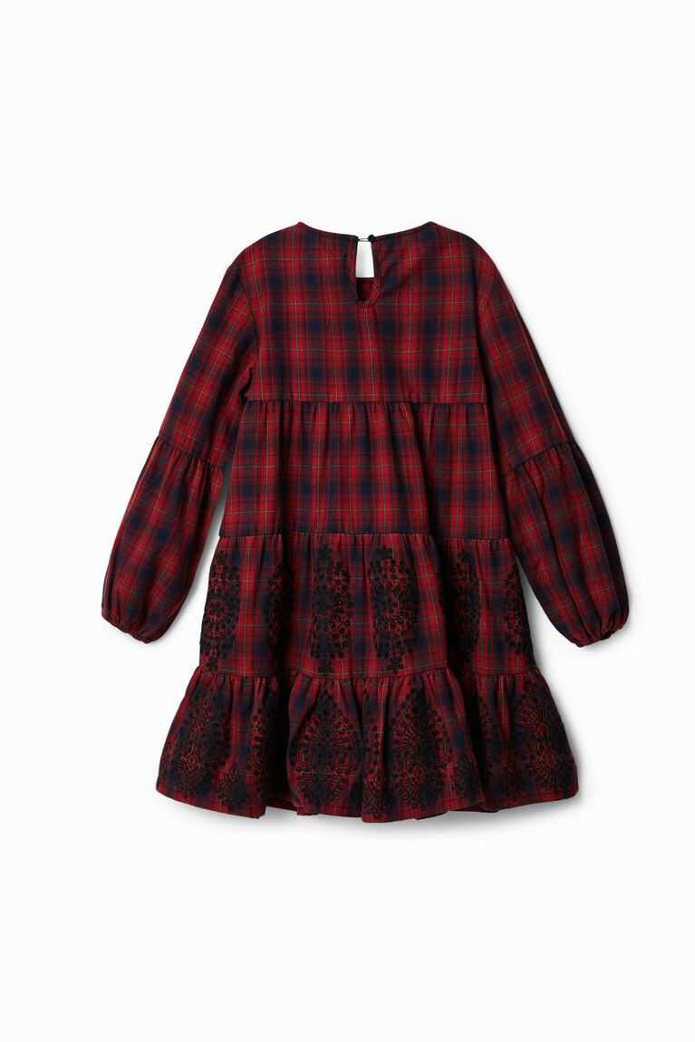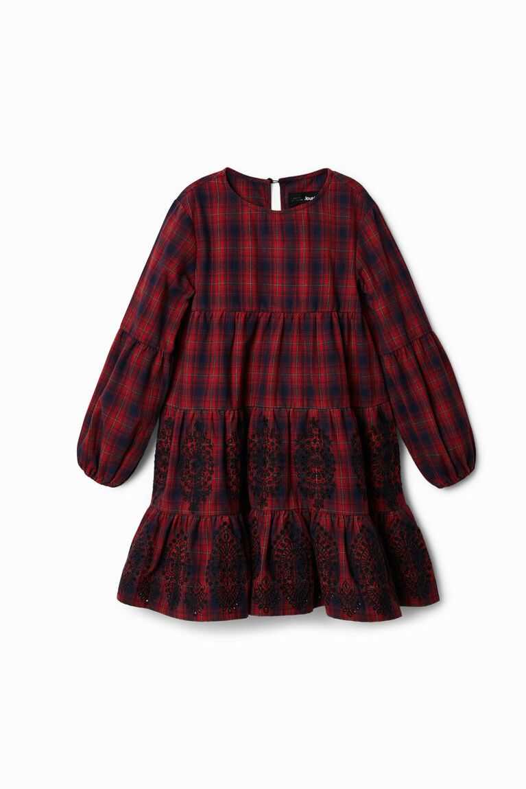 A long-sleeve plaid dress with contrasting swiss embroidery decorating the lower panels.