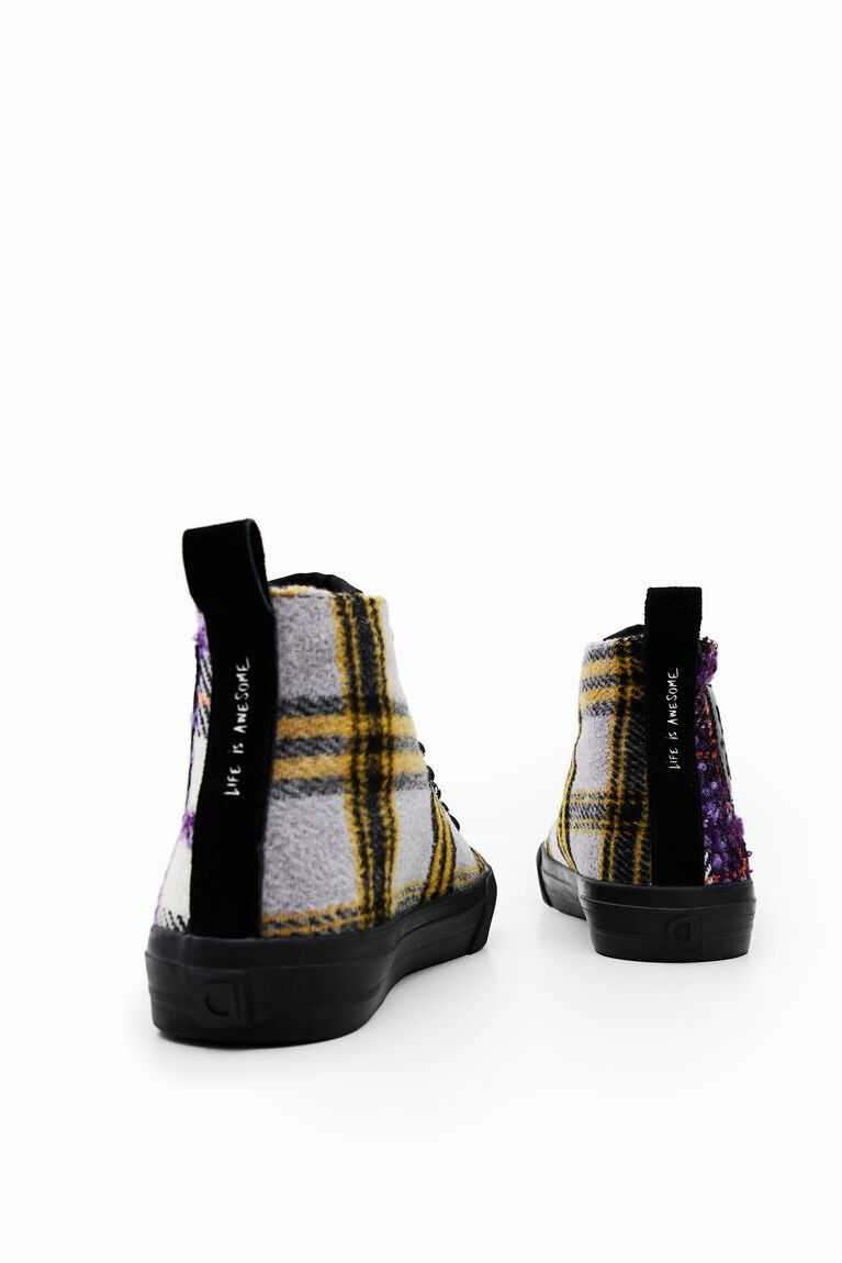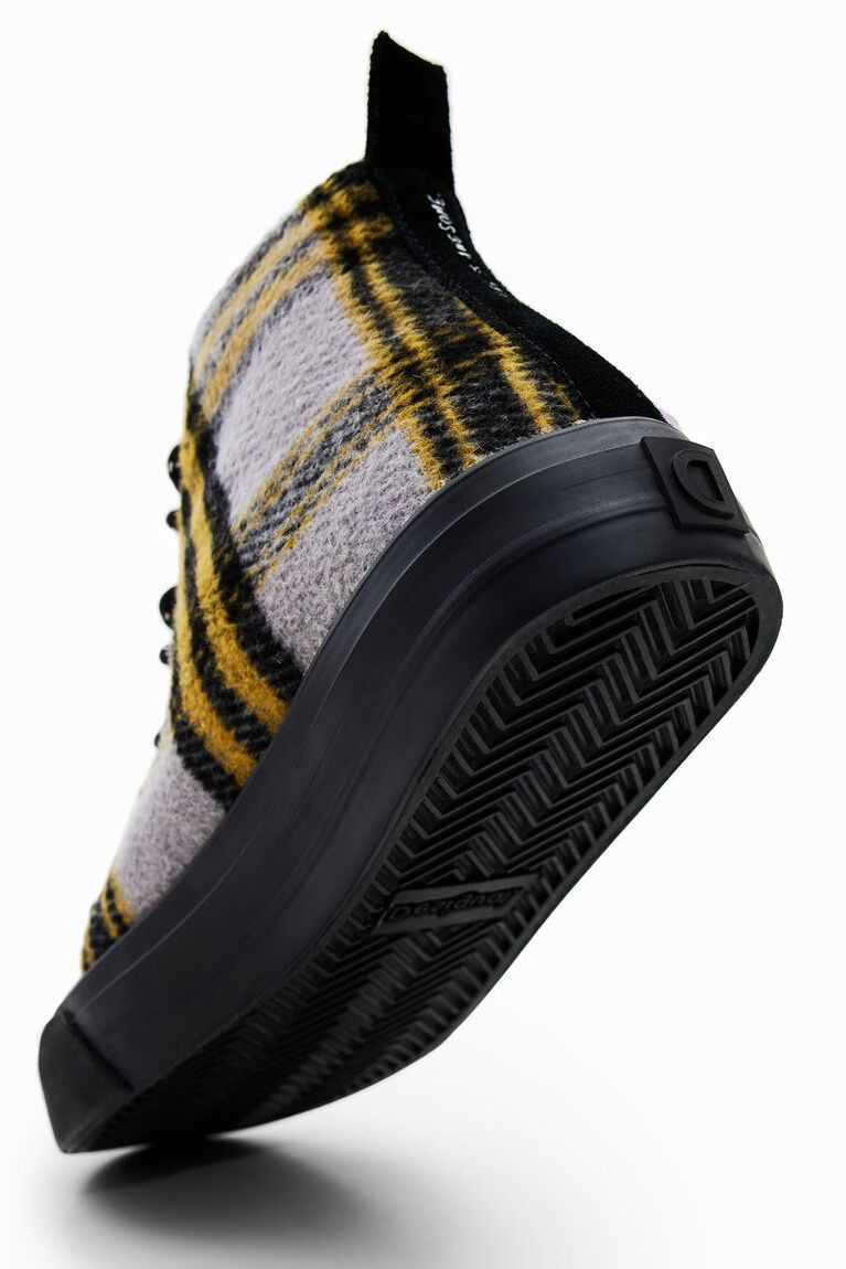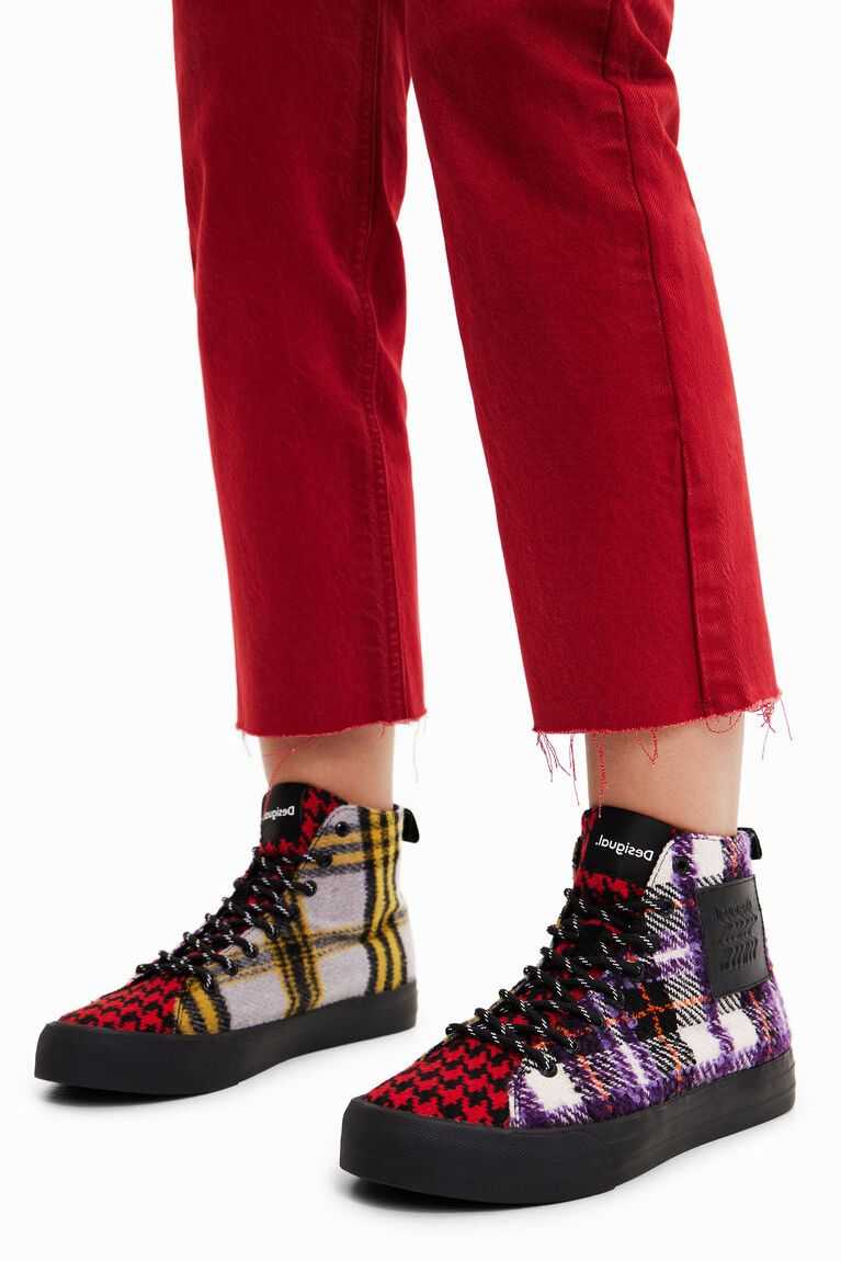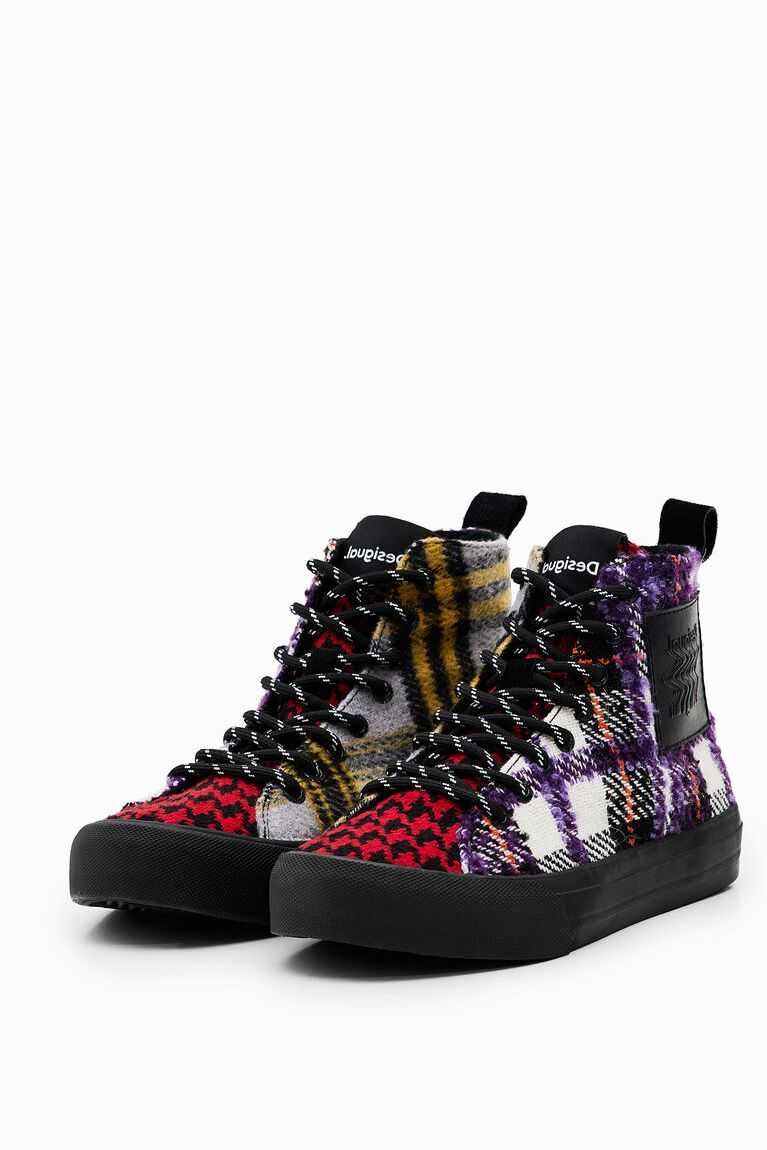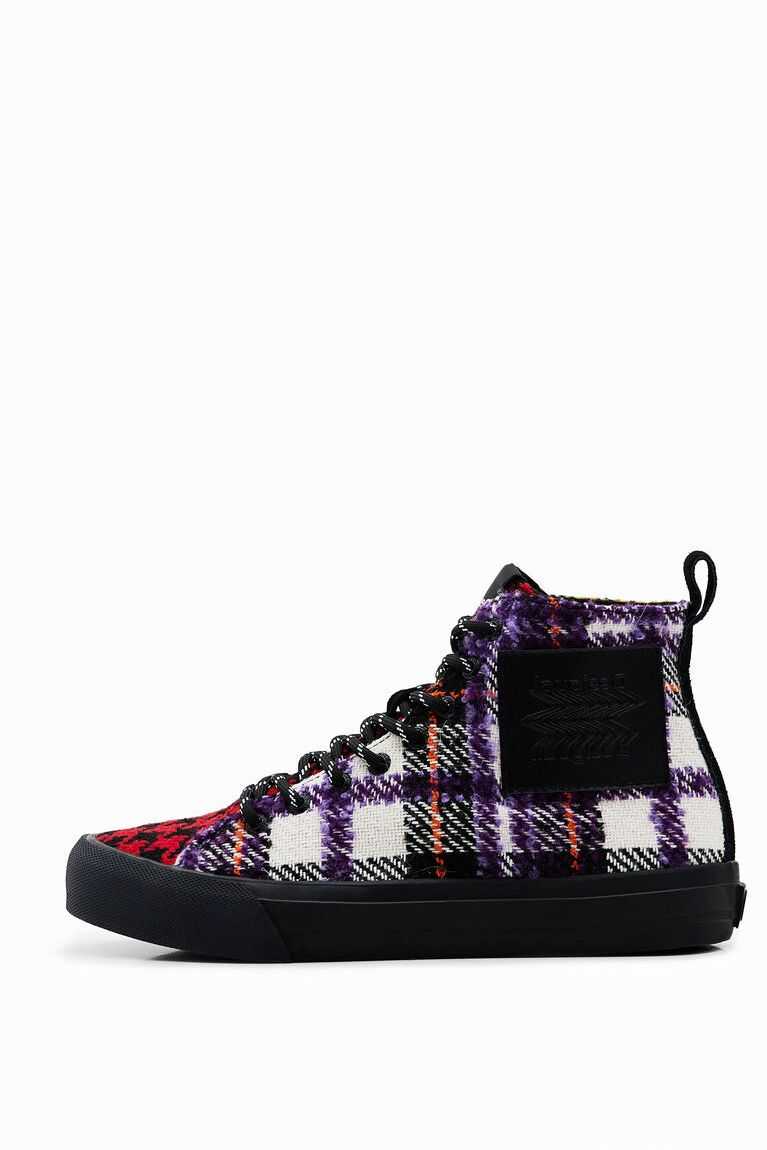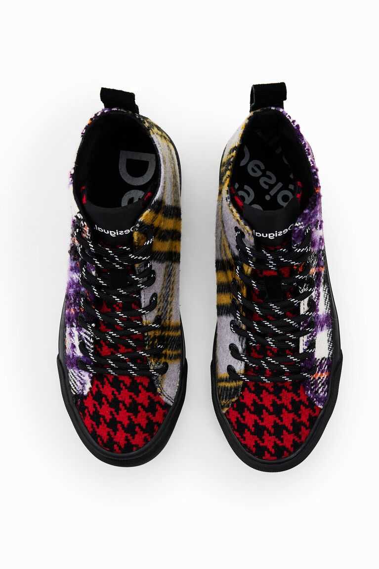 High-top sneakers with a patchwork of tartan in different textures and colours. Featuring two-tone trekking laces and black soles.