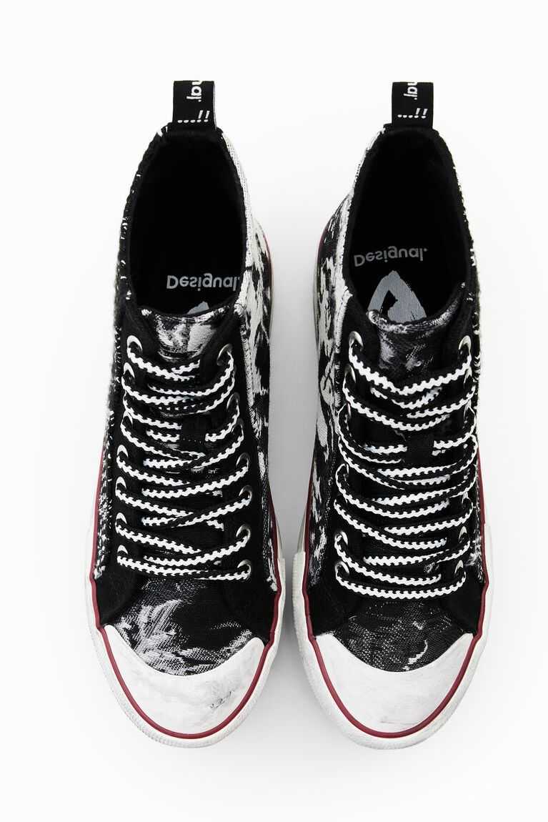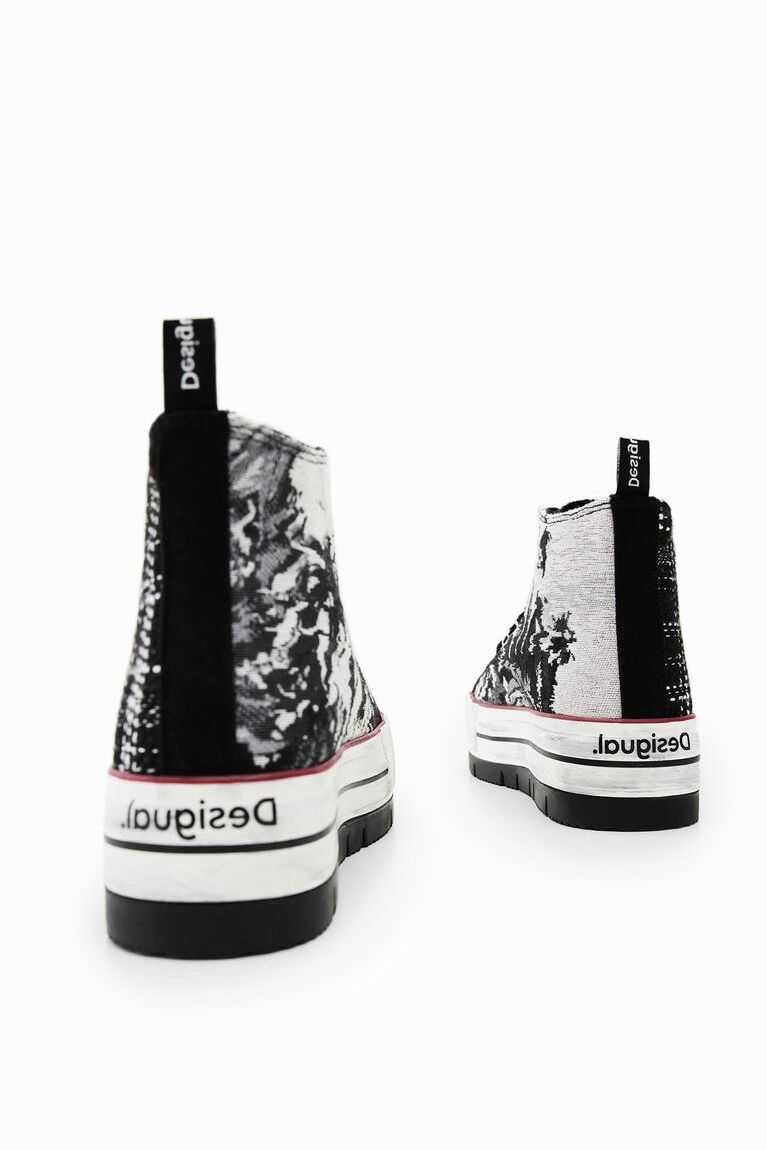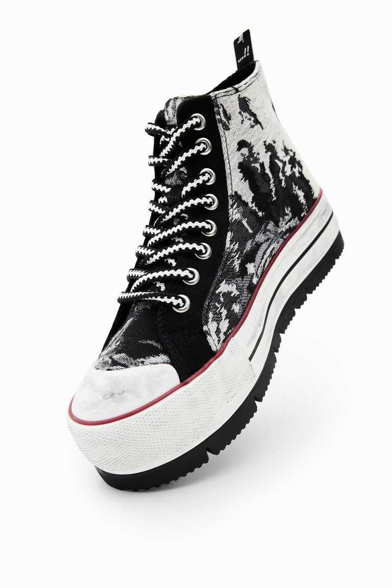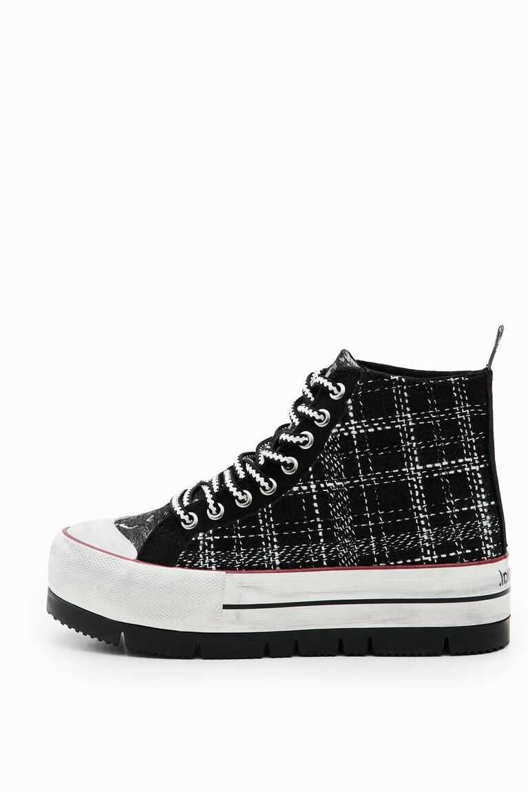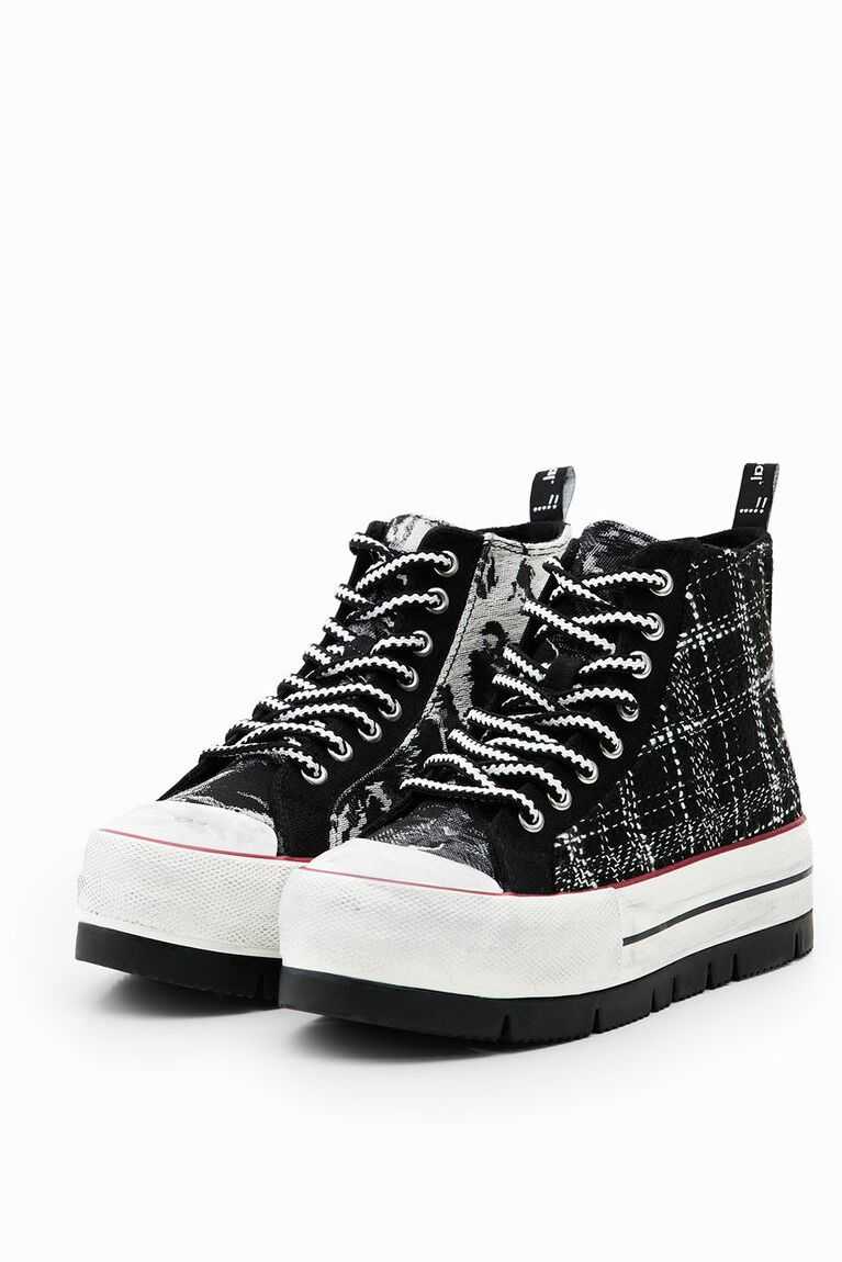 High-top sneakers with a two-tone platform sole, in tartan on one side and with a black-and-white print on the other. The laces are also two tone.