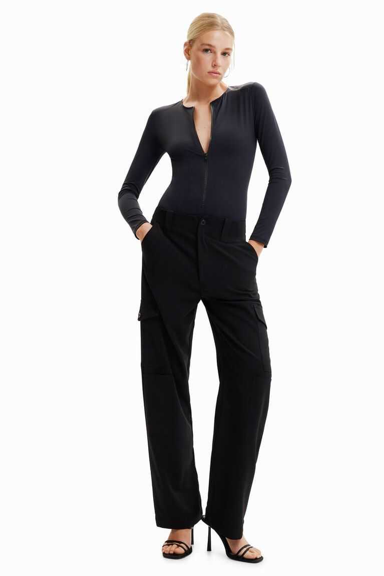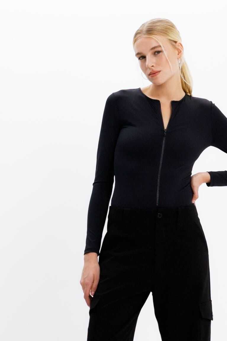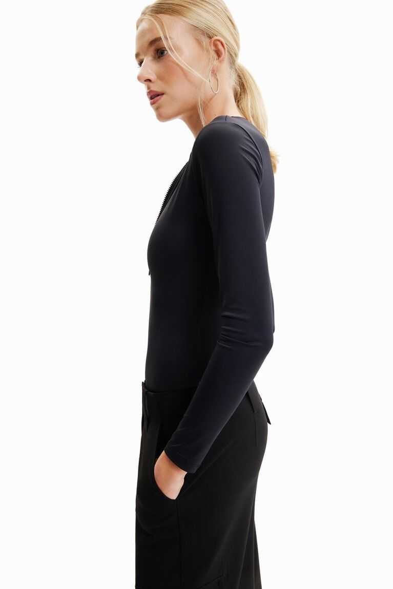 A fitted bodysuit in technical stretch knit fabric with long sleeves and a front zip.