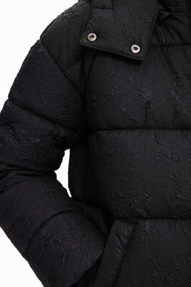 Comfortable and warm, this quilted jacket with a detachable hood is made from recycled fibres and features an embossed texture.