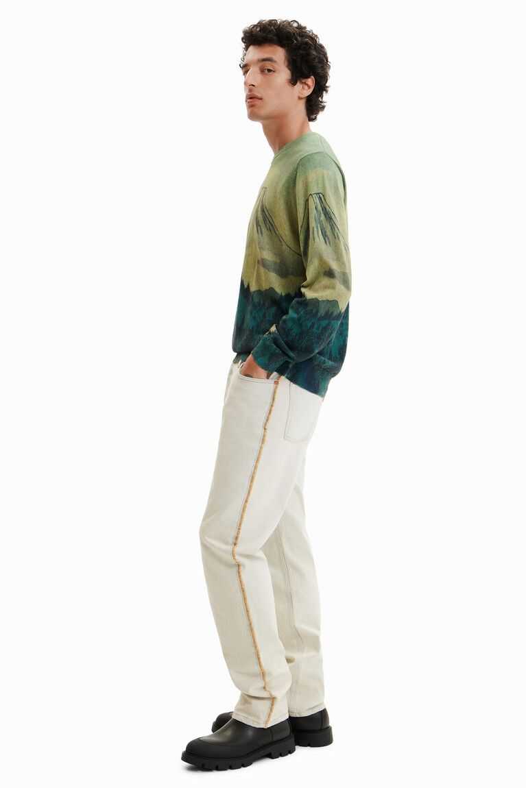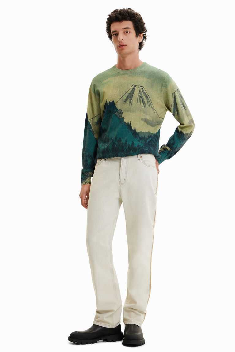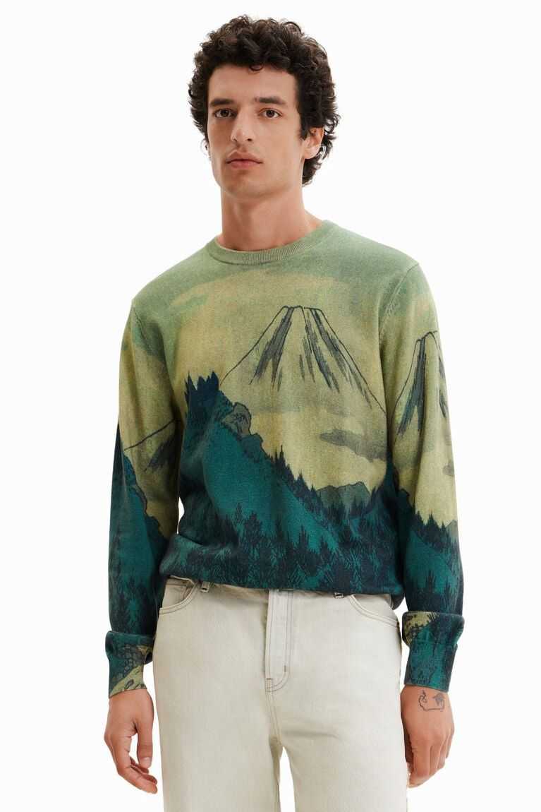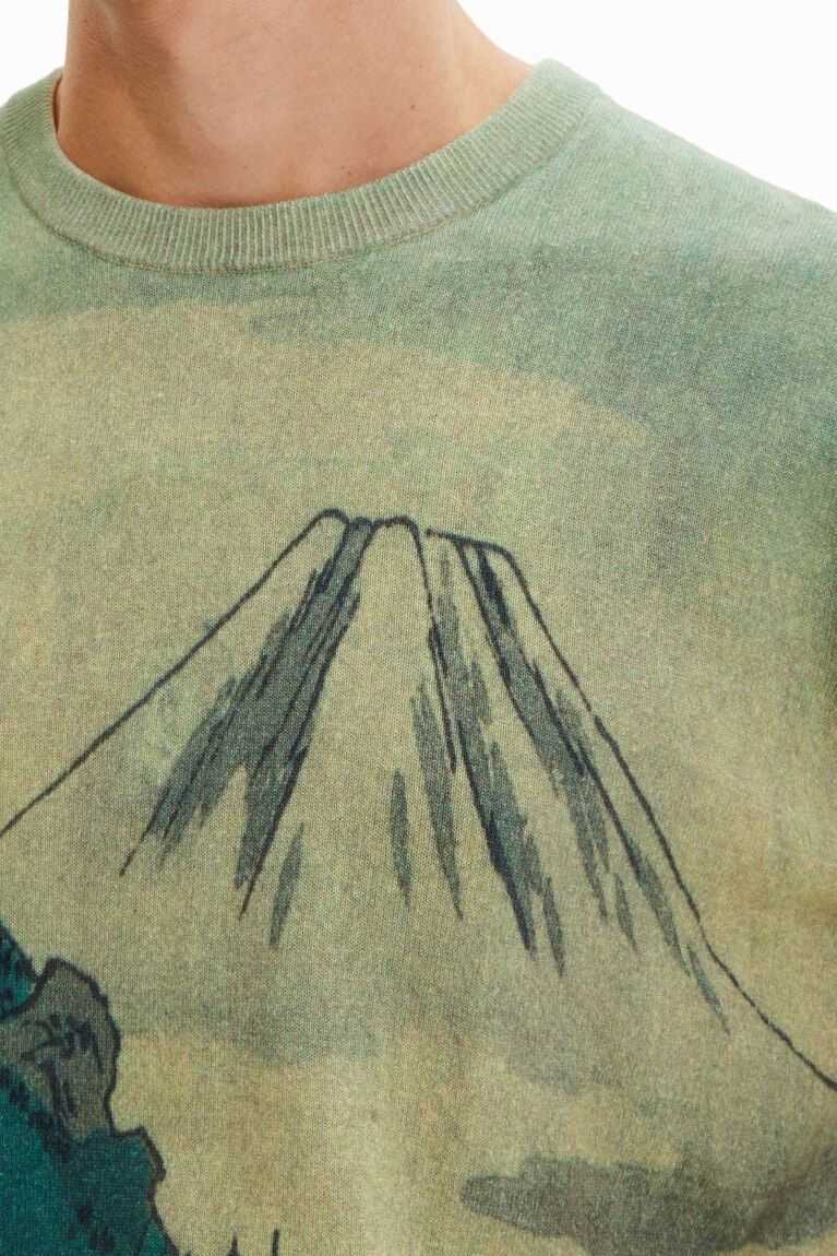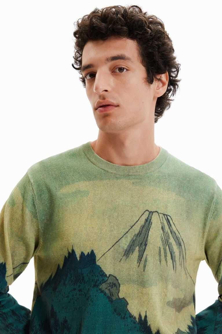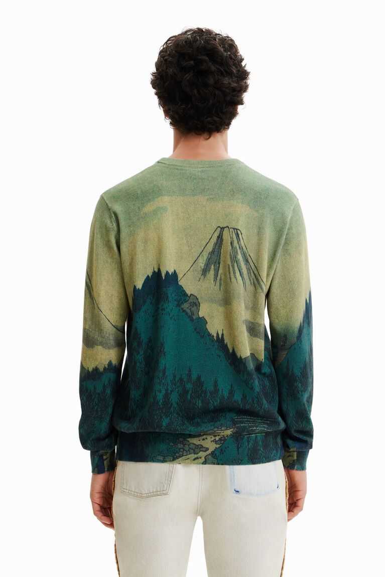 A fine-knit pullover with a soft feel and a print of a Japanese landscape illustration.