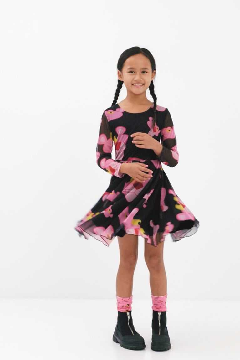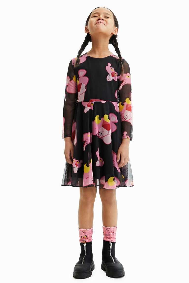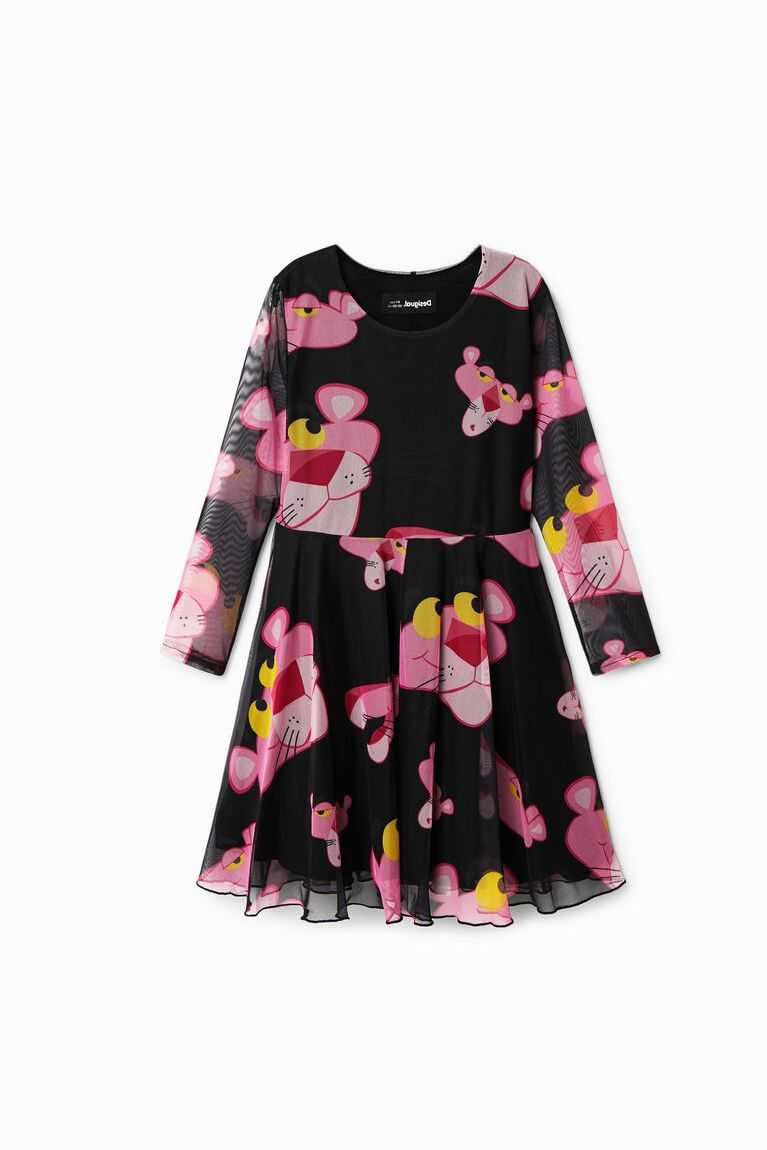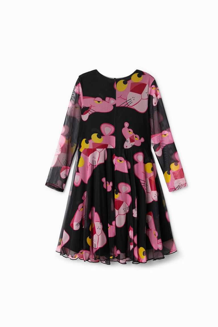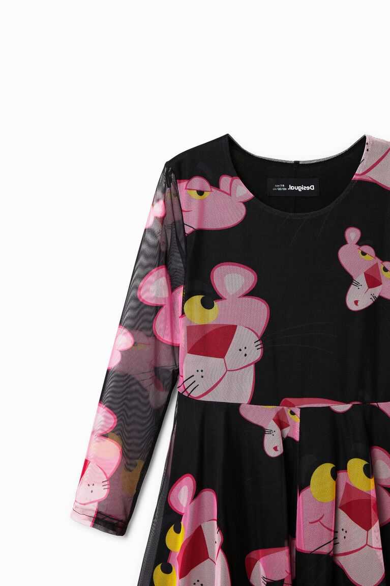 Long sleeves and tulle on a skater dress with an all-over Pink Panther print. Made from eco-friendly fibres.