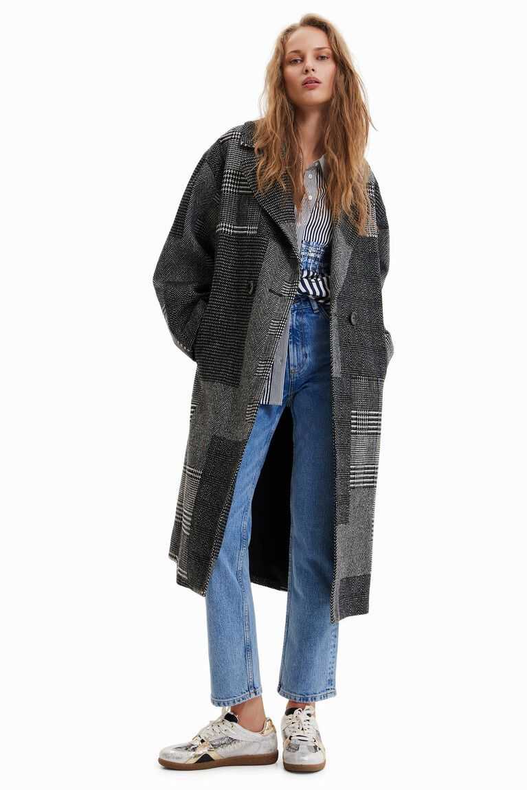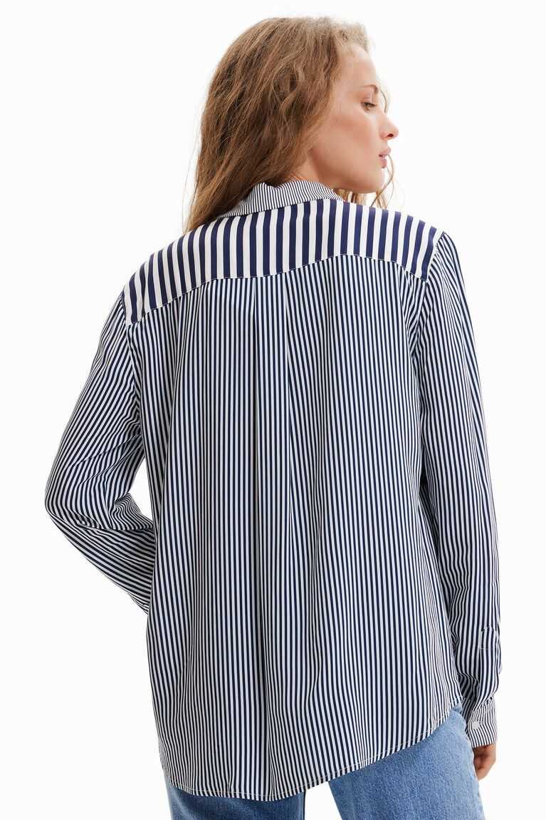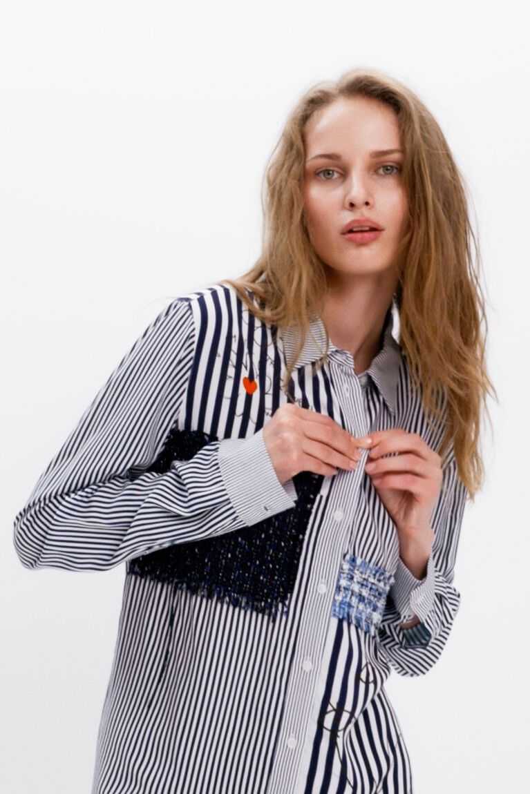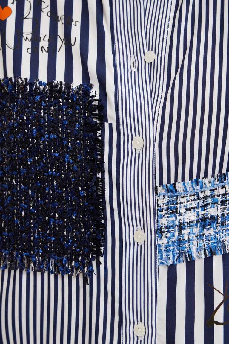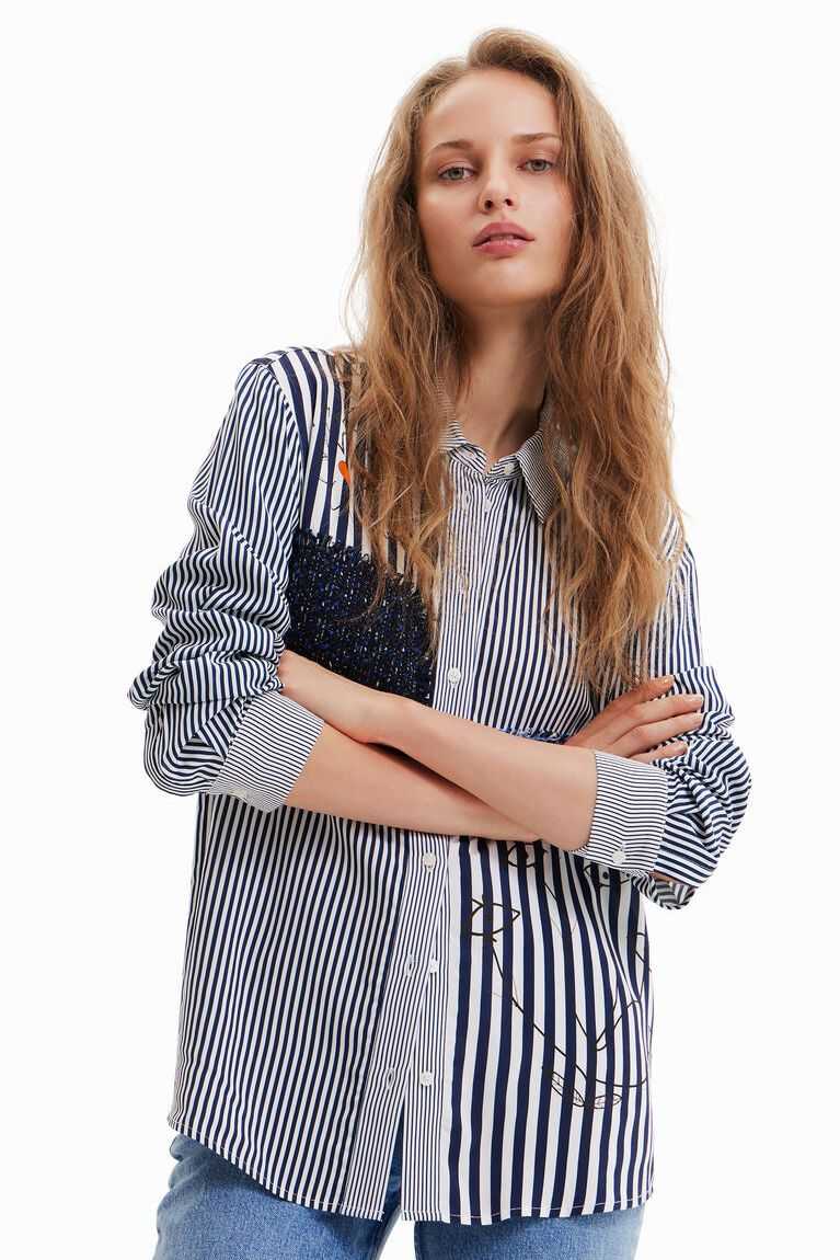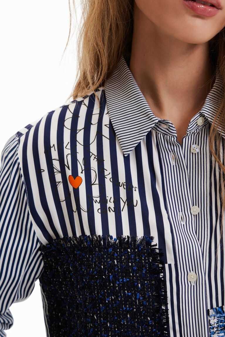 Patchwork tweed bands and a hand-drawn flower print give a Desigual touch to this shirt with stripes of different thicknesses. Featuring text and raw-cut details.