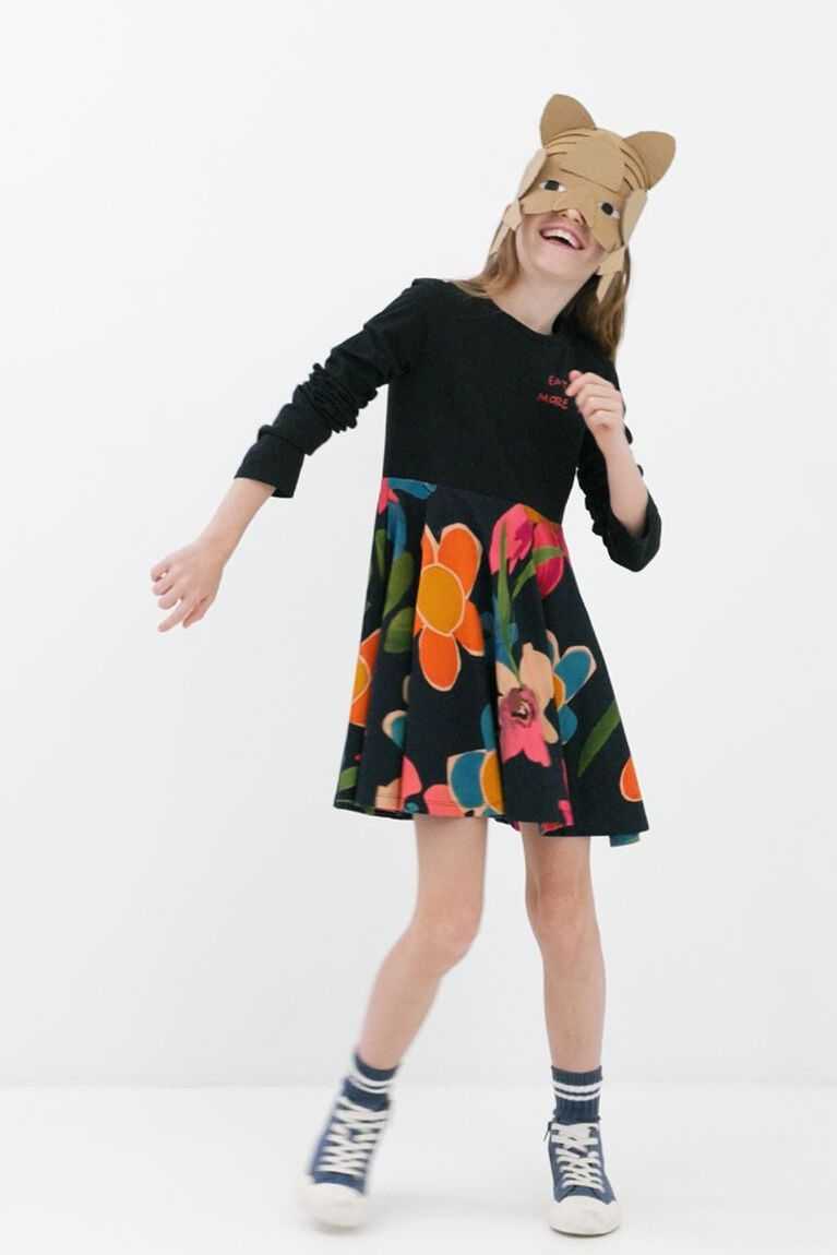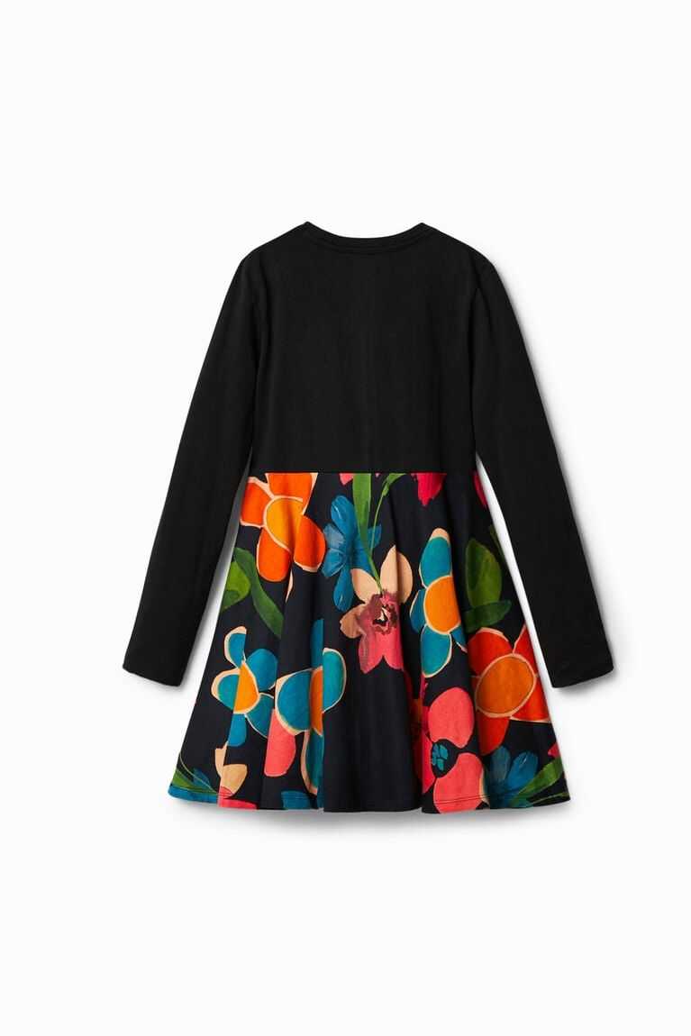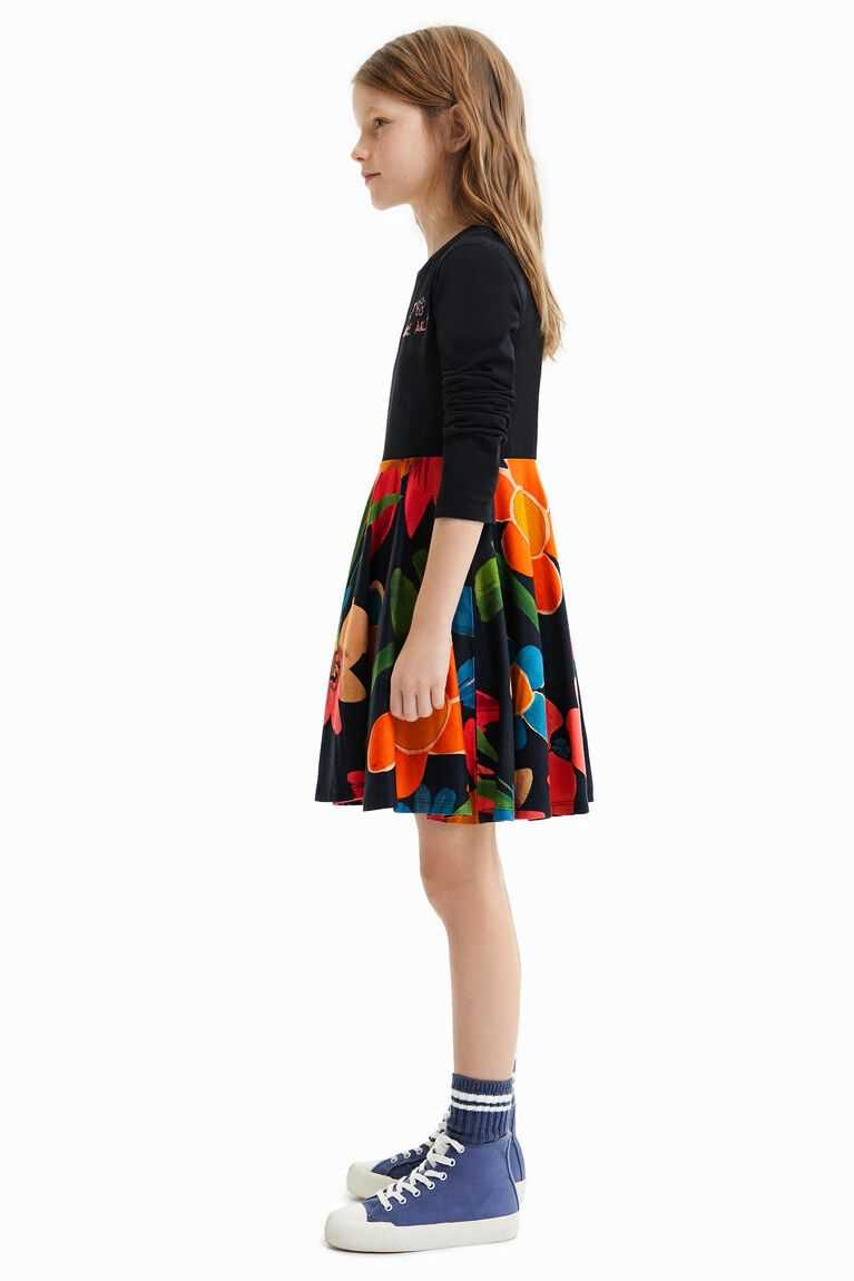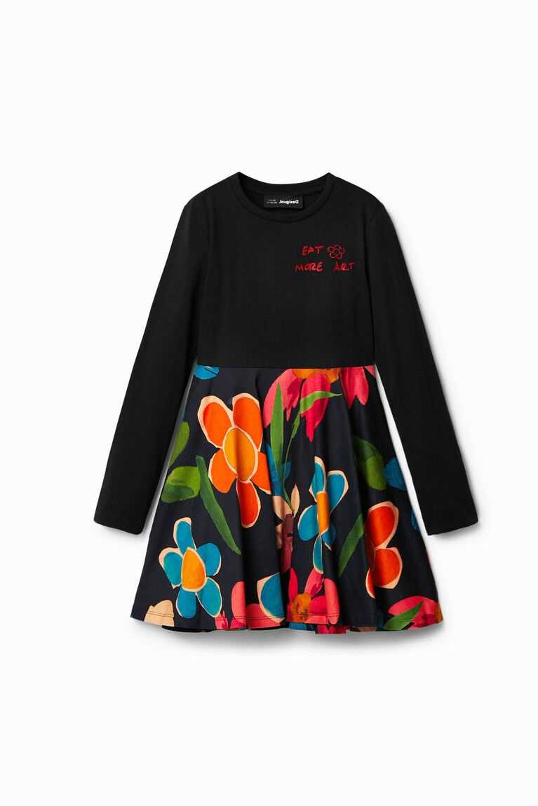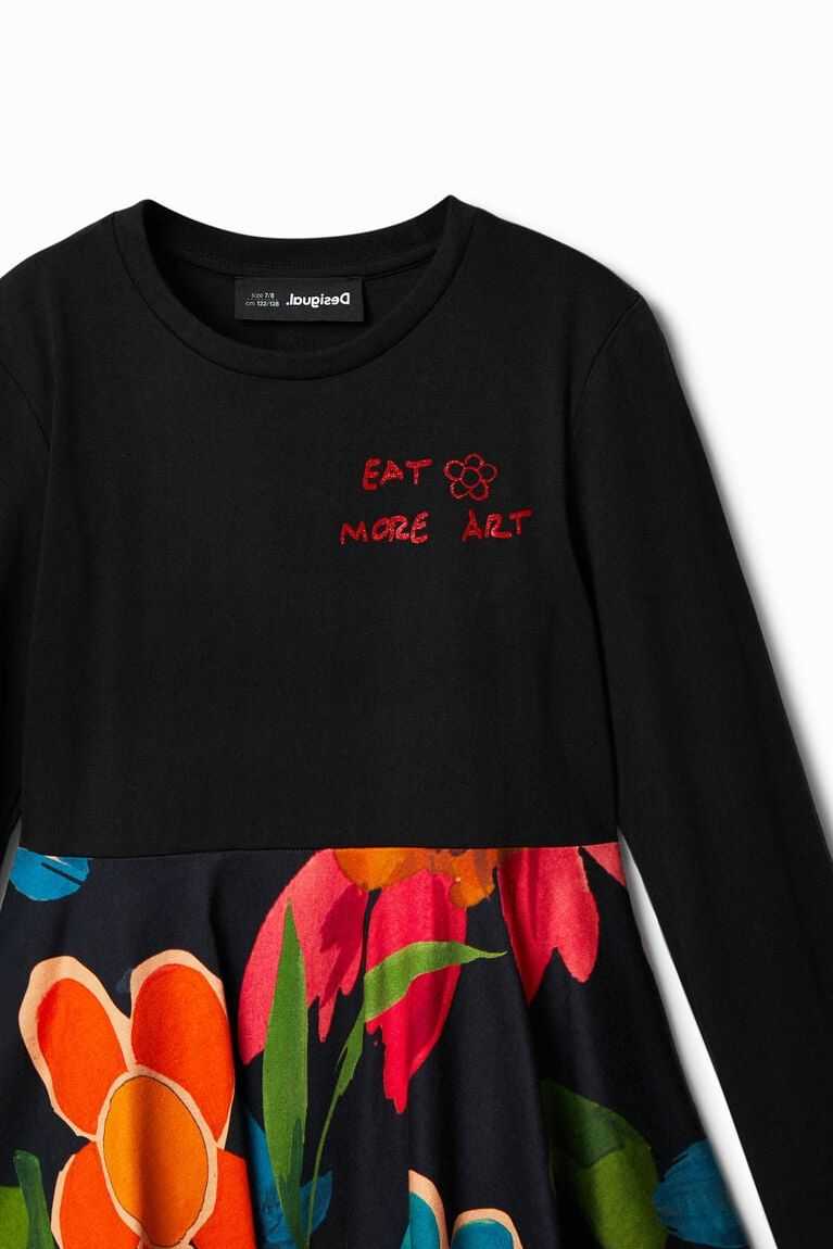 A two-in-one long-sleeve dress where the top is in a plain colour with "Eat More Art" text and the bottom is a floral print tulle skirt.