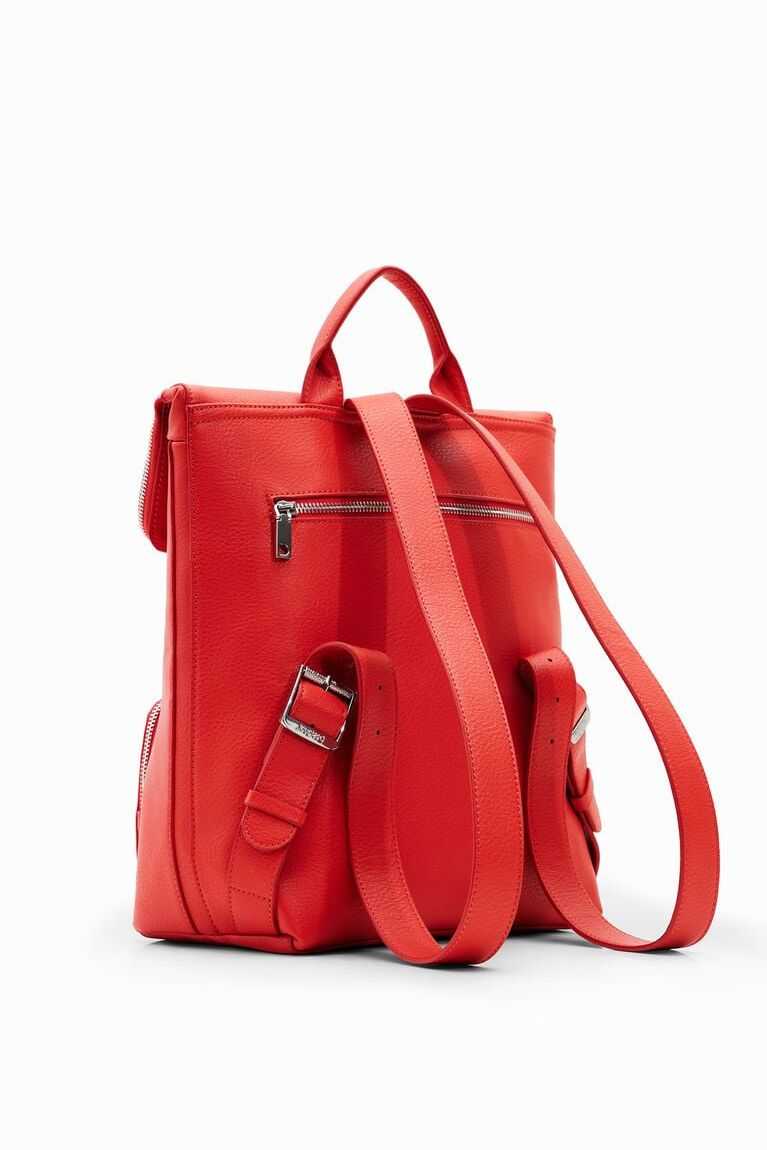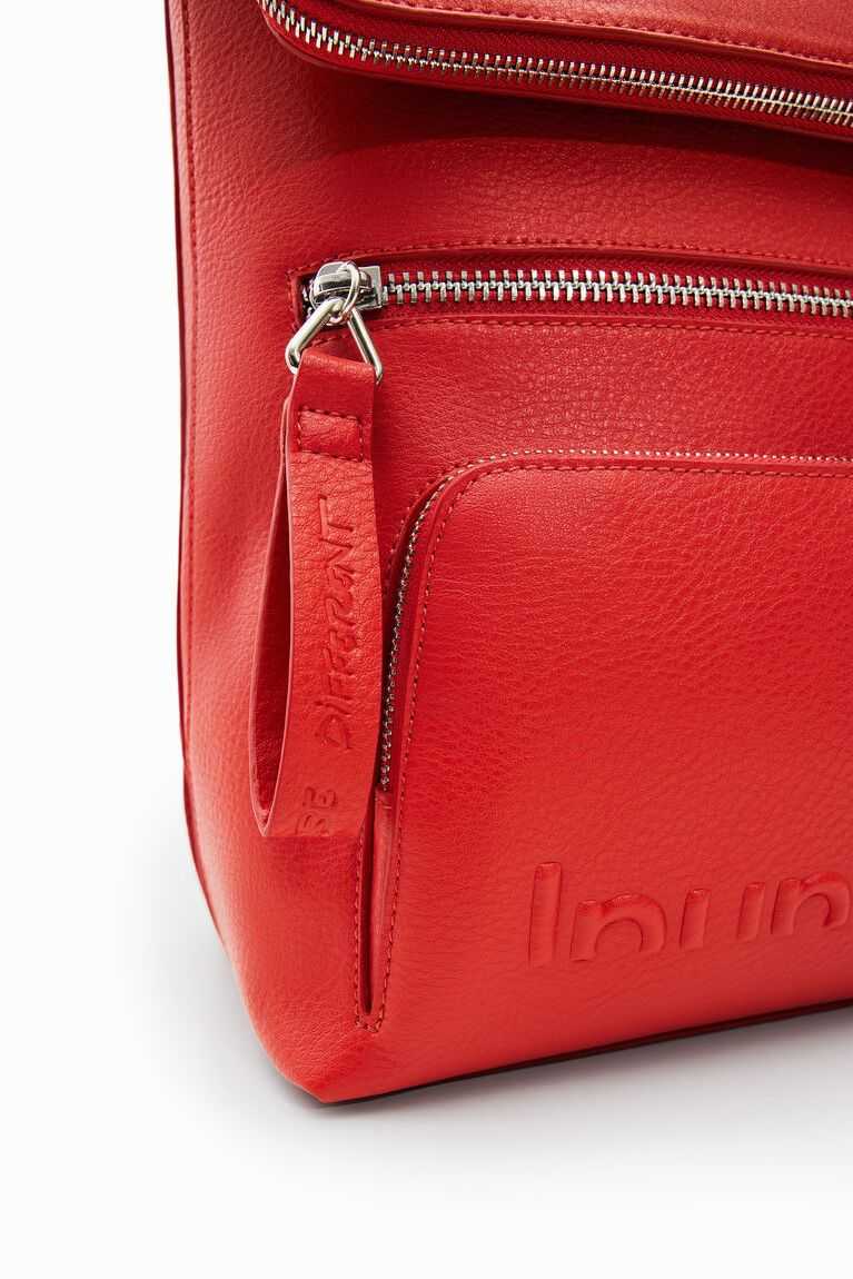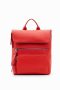 Urban backpack with a flap closure in faux leather featuring a large outside pocket with a half logo. The interior is made from tone-on-tone fabric with the message: Save Nature.