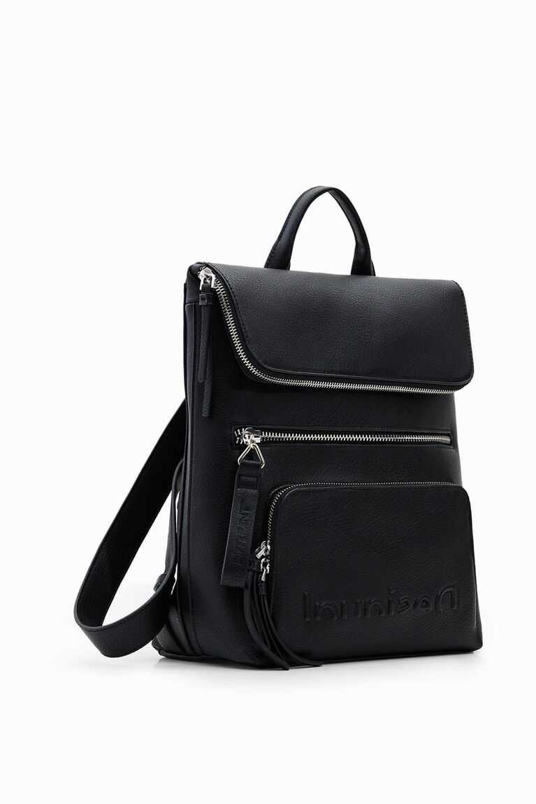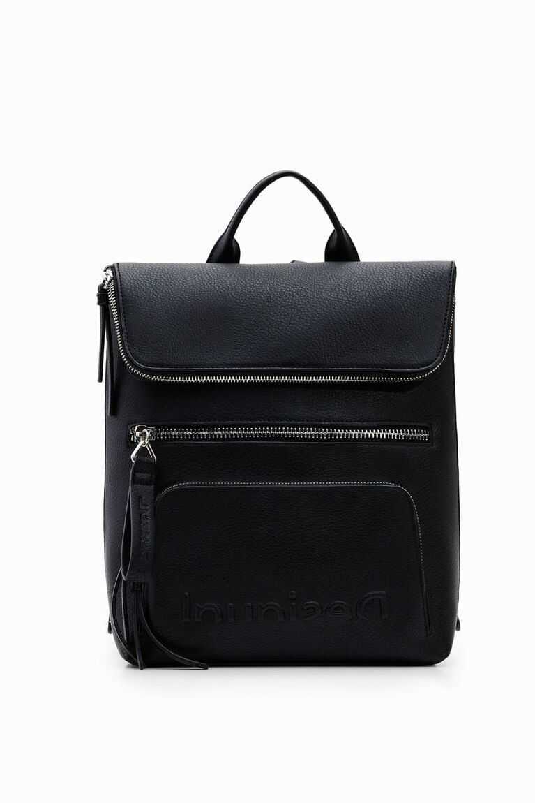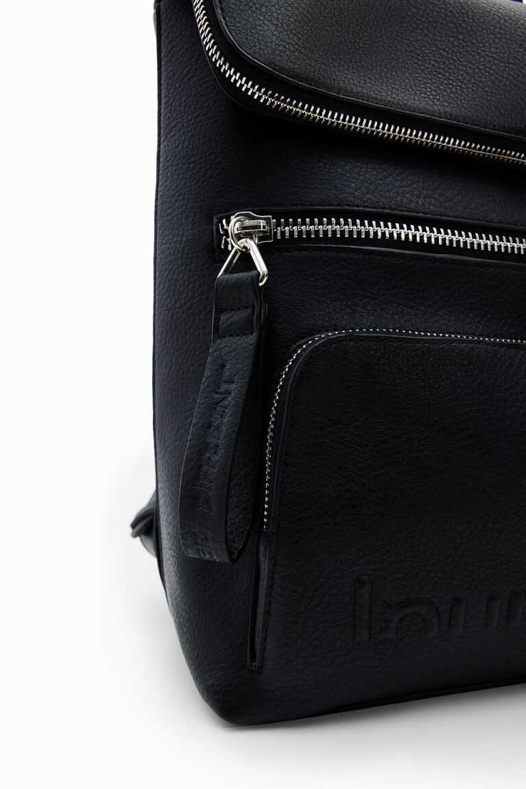 Urban backpack with a flap closure in faux leather featuring a large outside pocket with a half logo. The interior is made from tone-on-tone fabric with the message: Save Nature.
