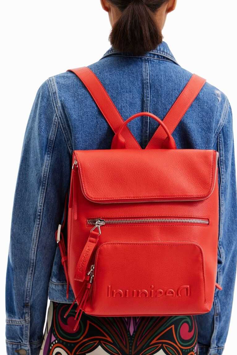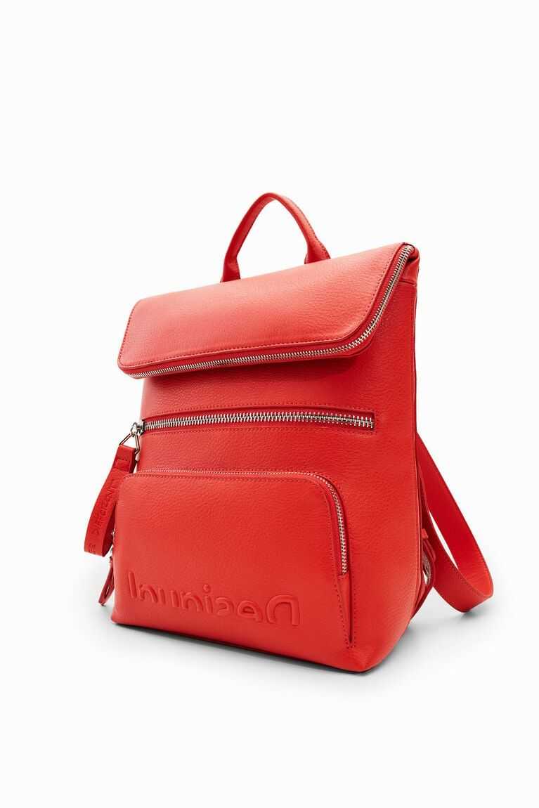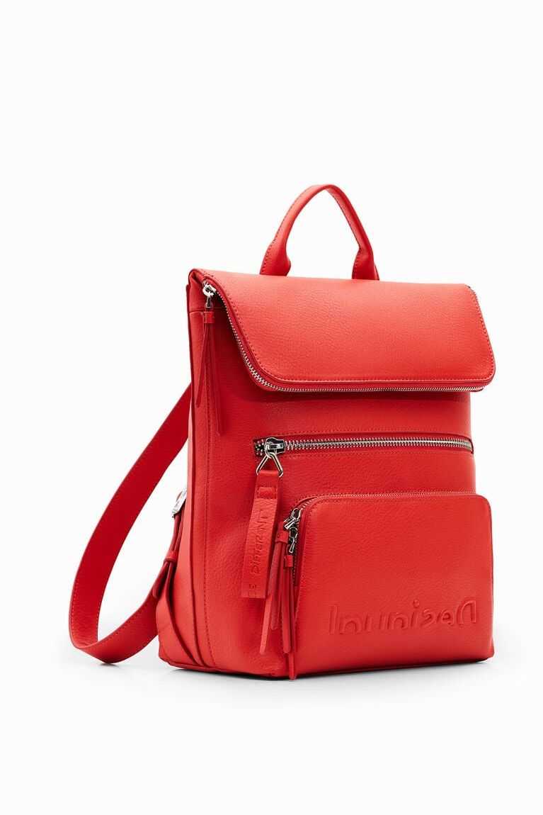Urban backpack with a flap closure in faux leather featuring a large outside pocket with a half logo. The interior is made from tone-on-tone fabric with the message: Save Nature.