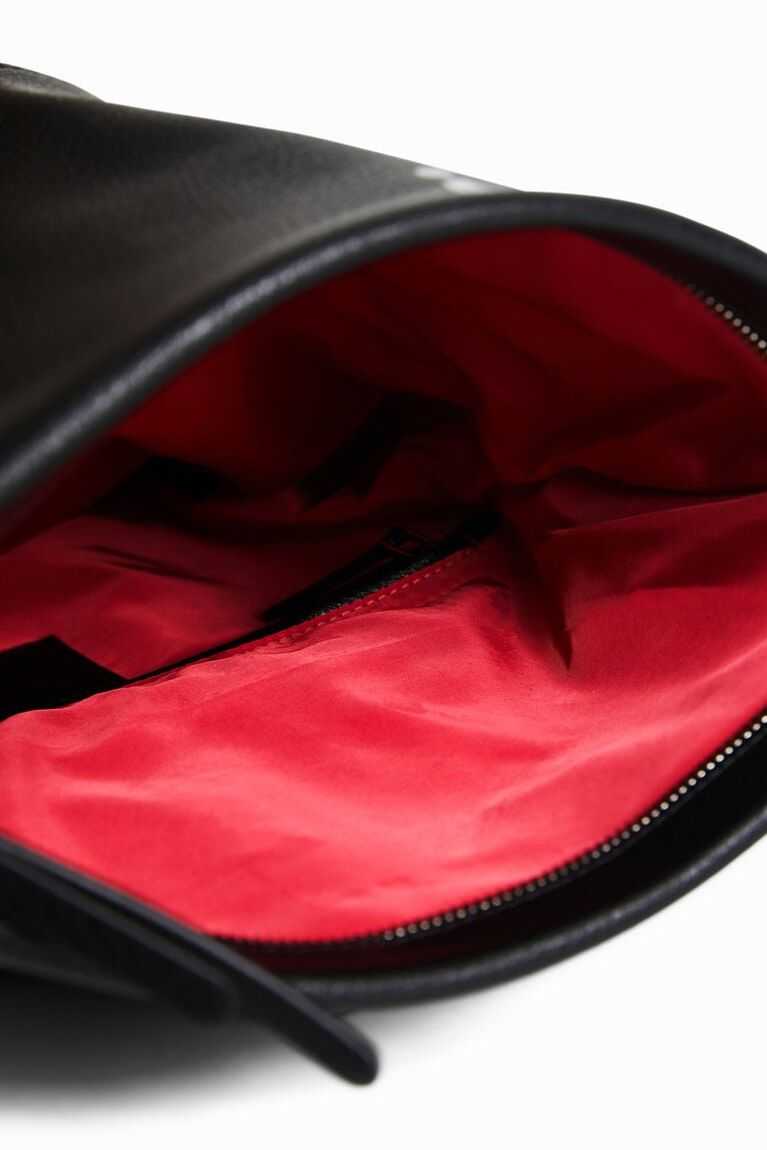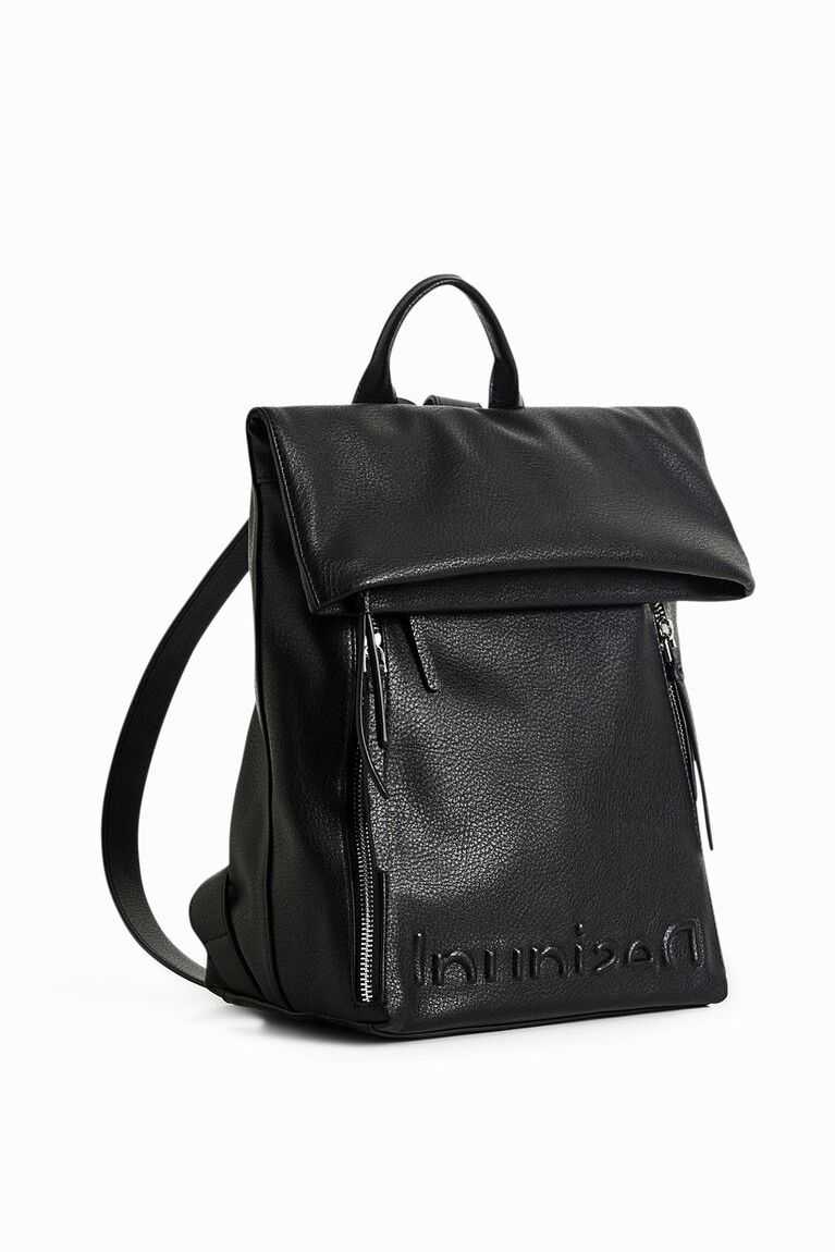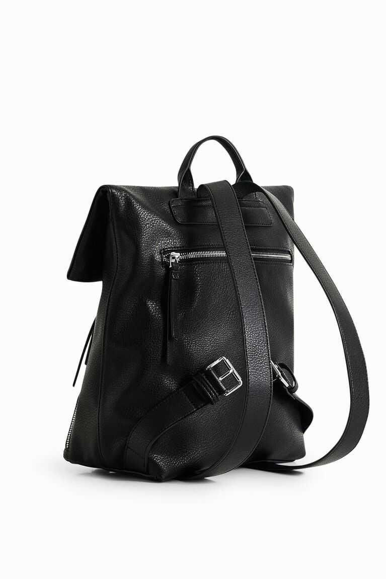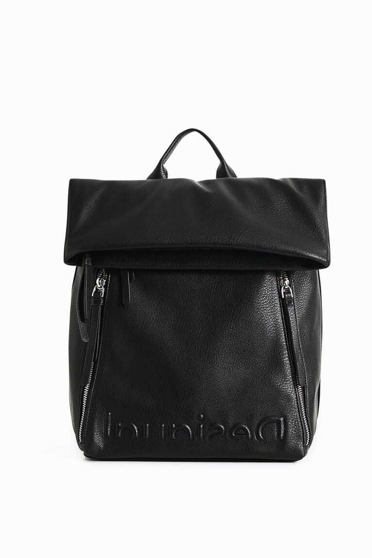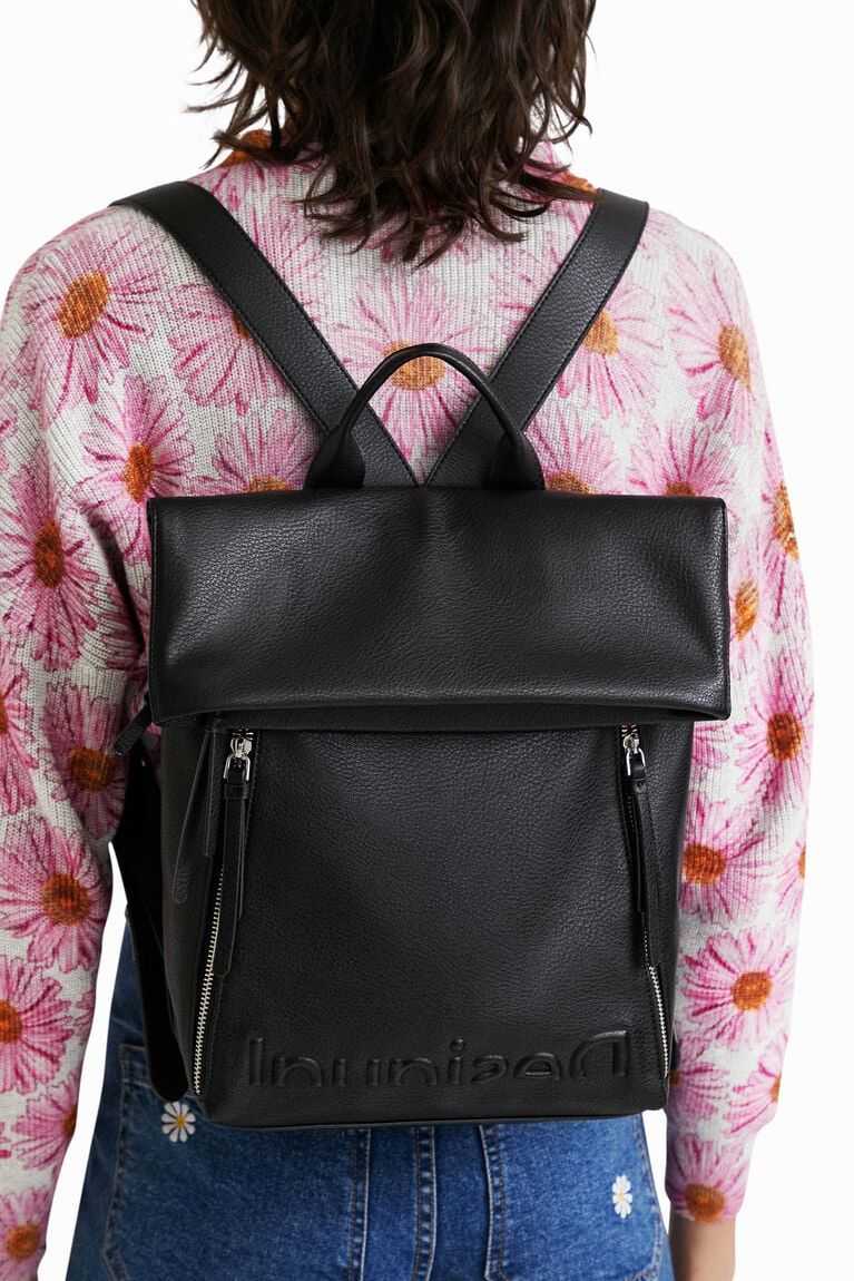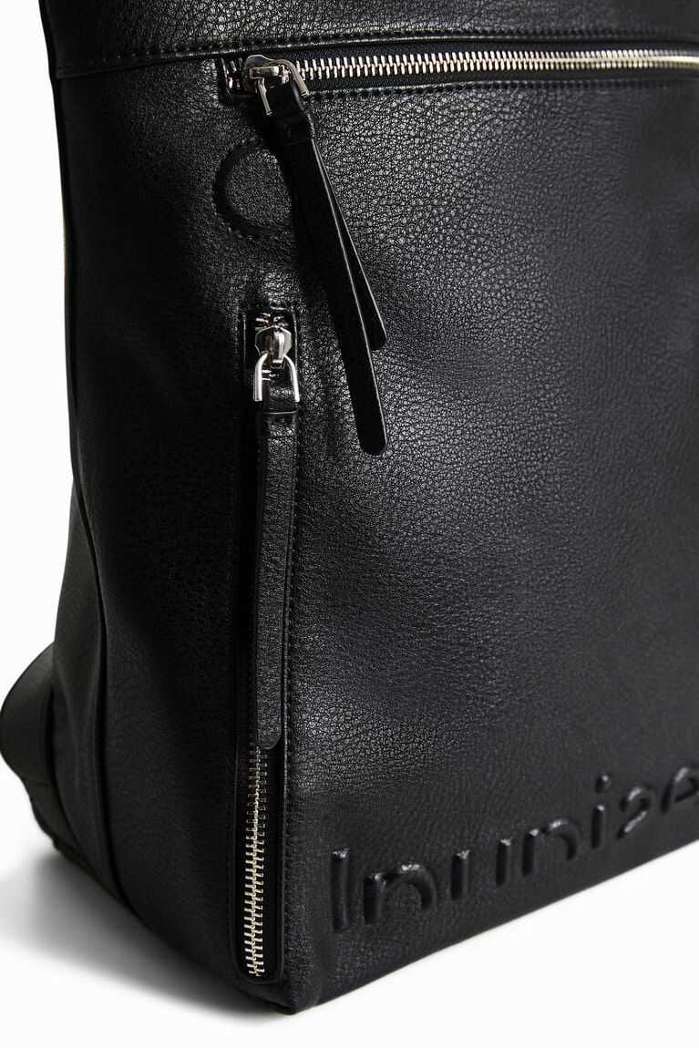 In faux leather and with multiple zip pockets, this urban backpack with an interior zip carries the message of the collection under the flap and features an embossed logo at the bottom.