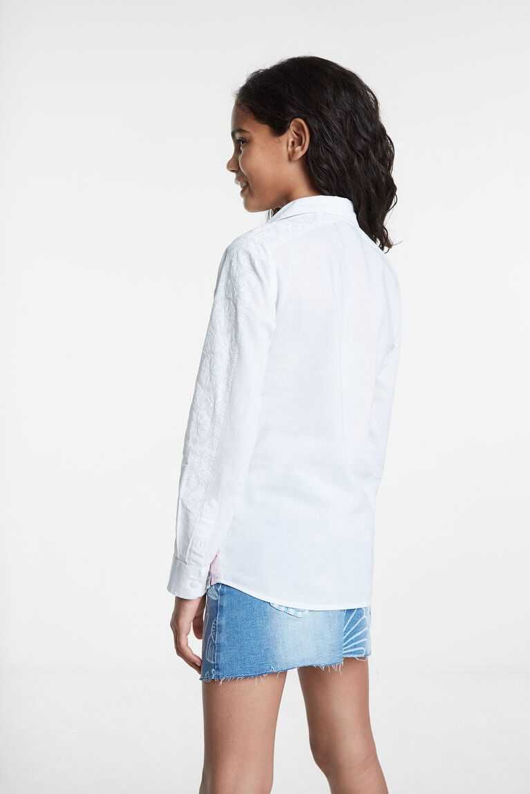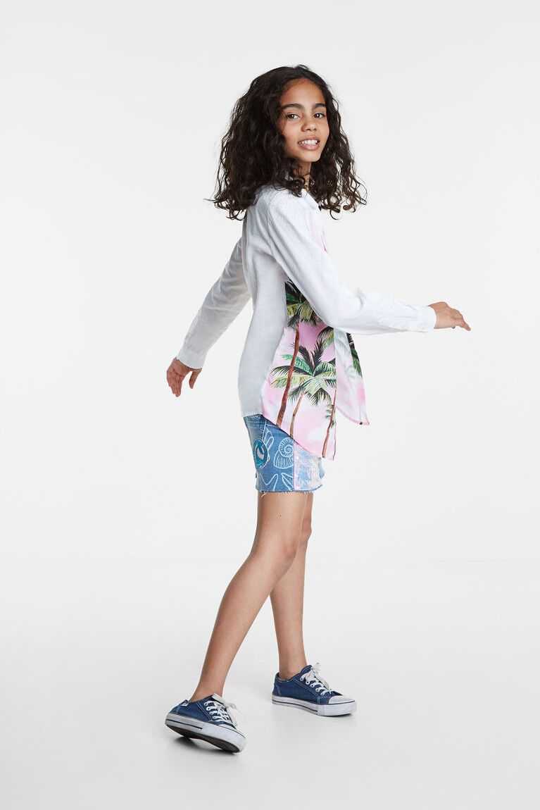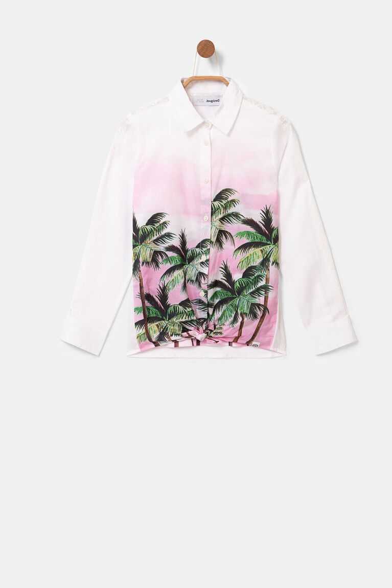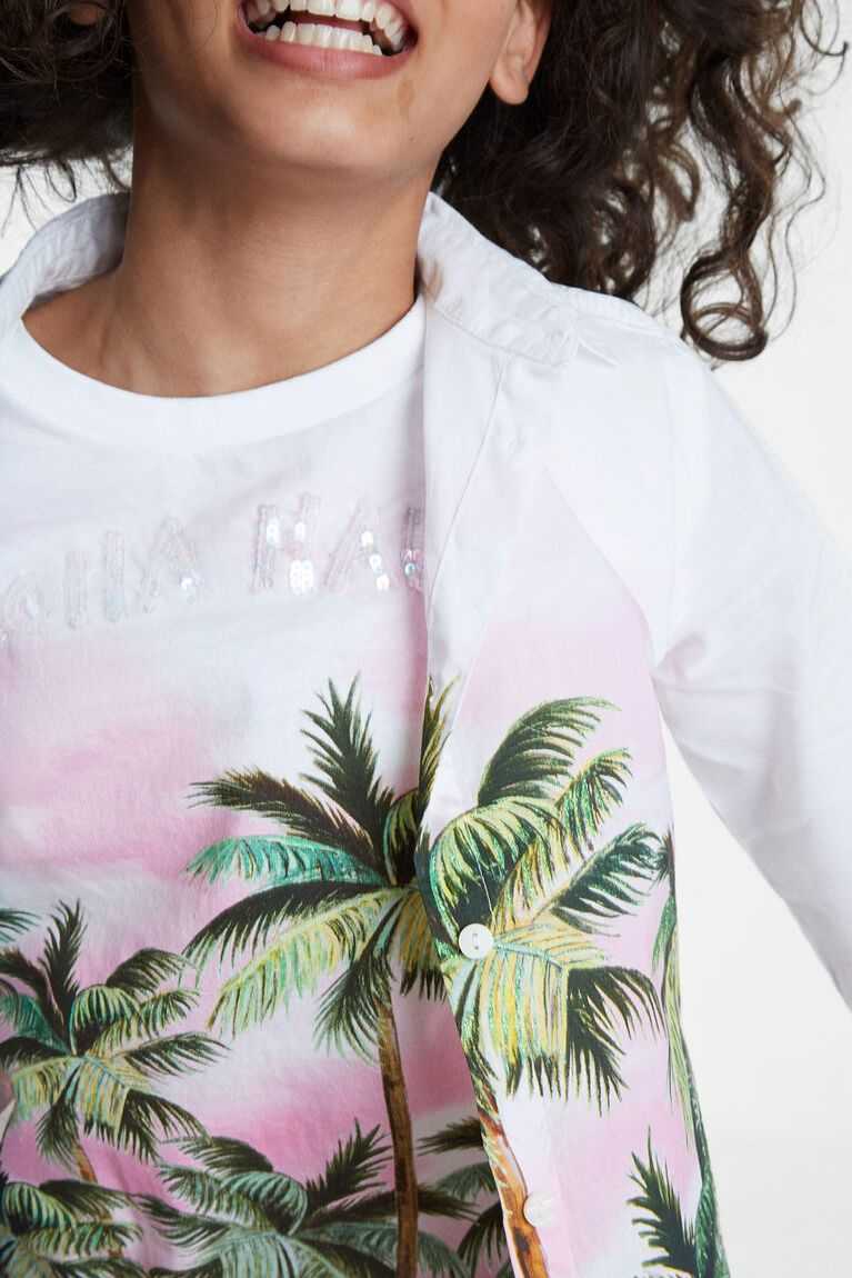 The Hawaiian inspiration combines with this double-layer long sleeve shirt with knotting at the hem. The print of palm trees in a Hawaiian landscape at sunset is maintained when unbuttoning and discovering the inner layer. The possibilities of wearing it in one way or another are numerous.