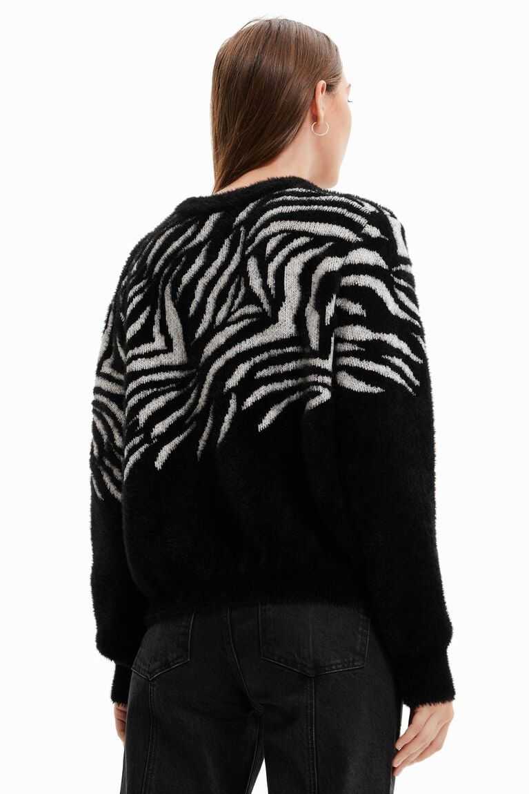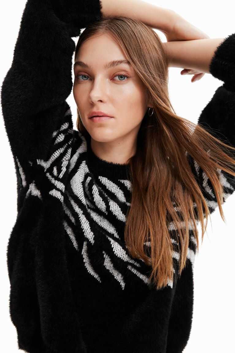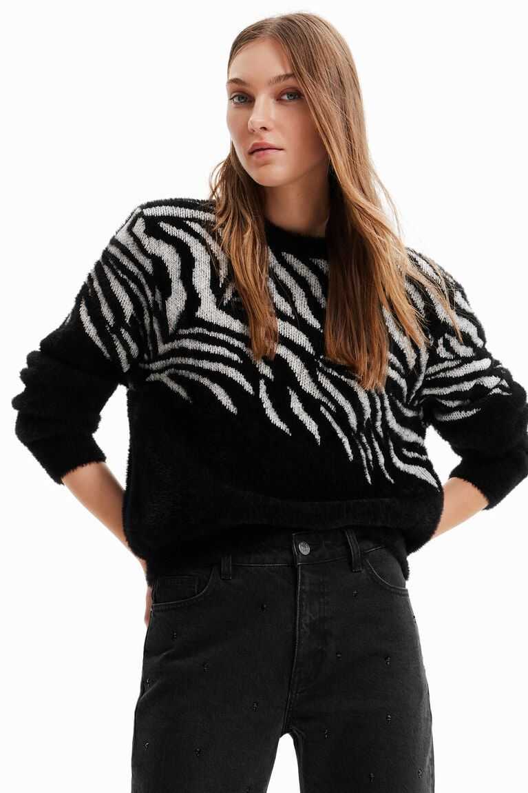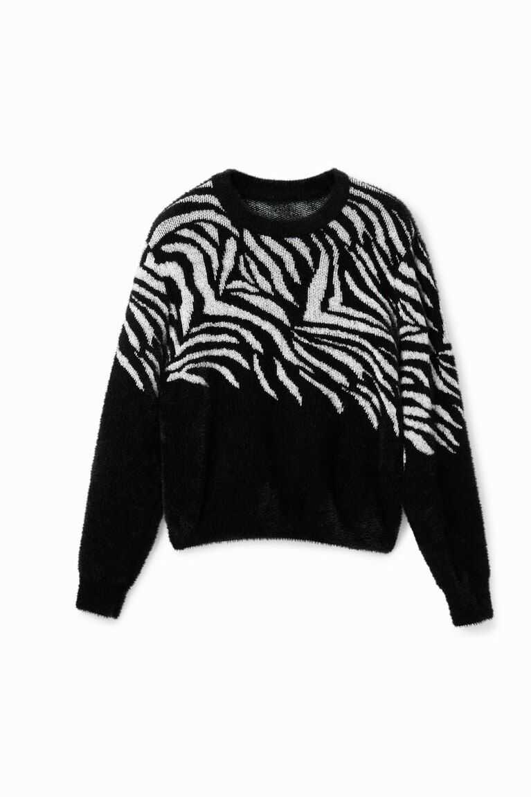 A long-sleeve jacquard knit pullover with a soft fur-effect texture and zebra-stripe design.